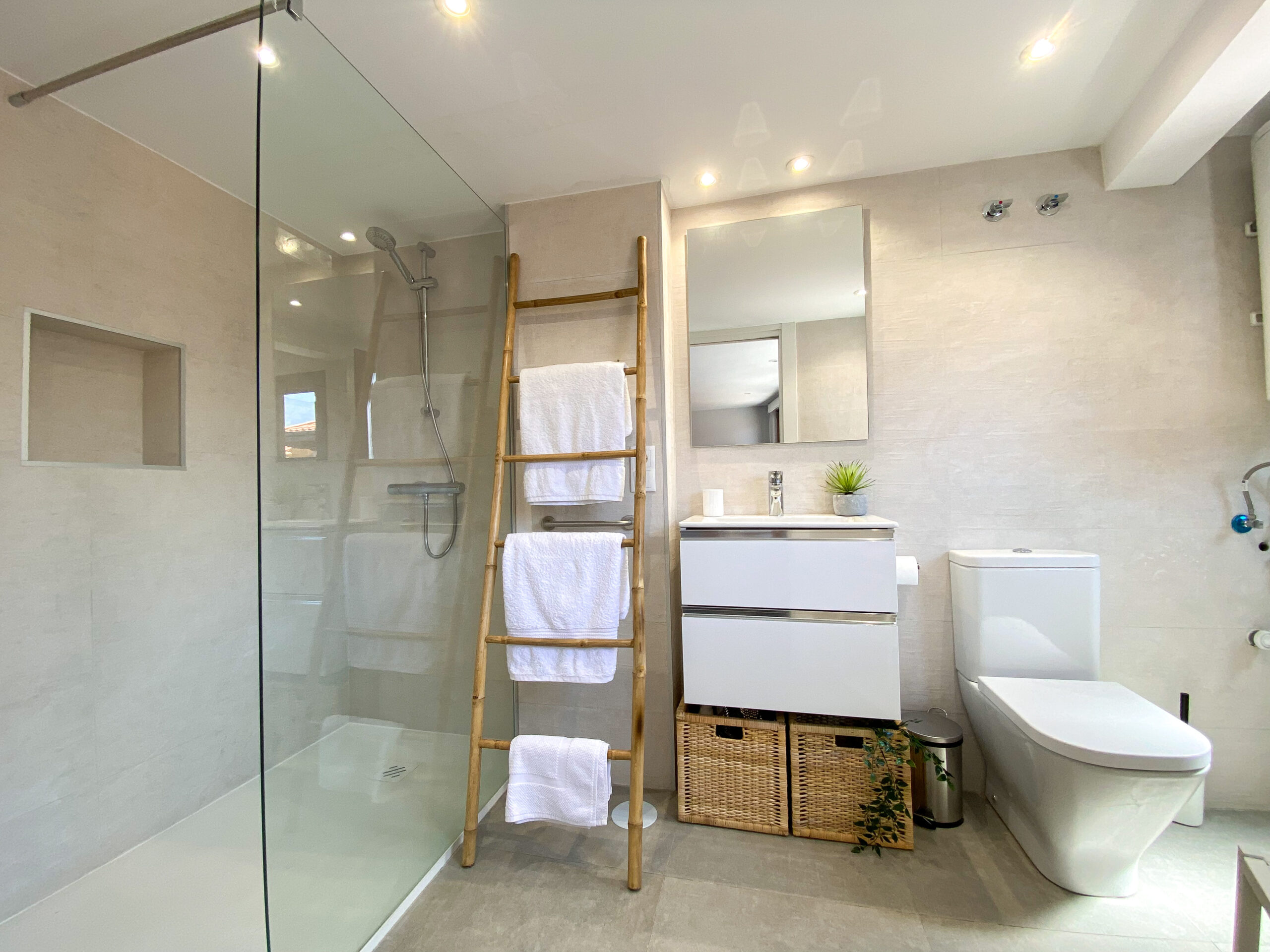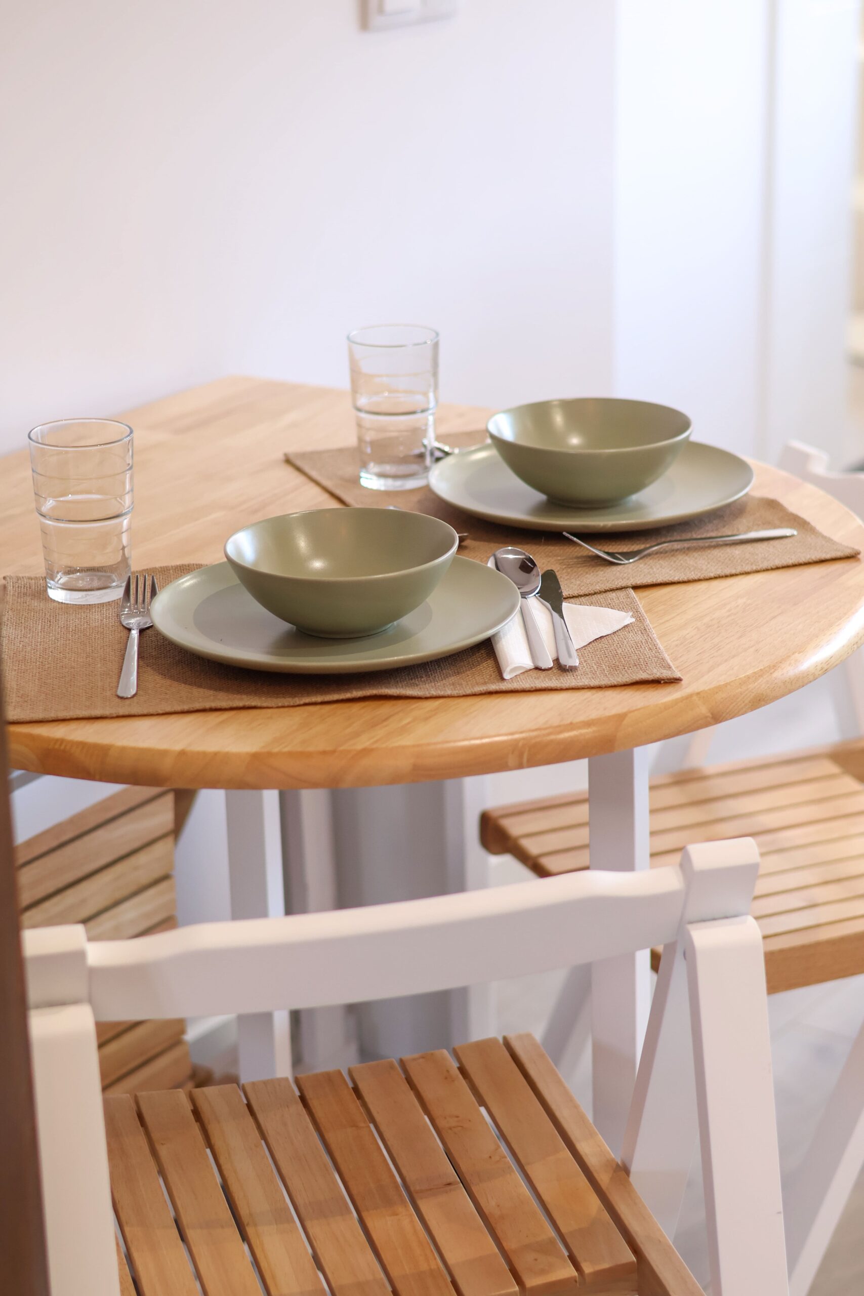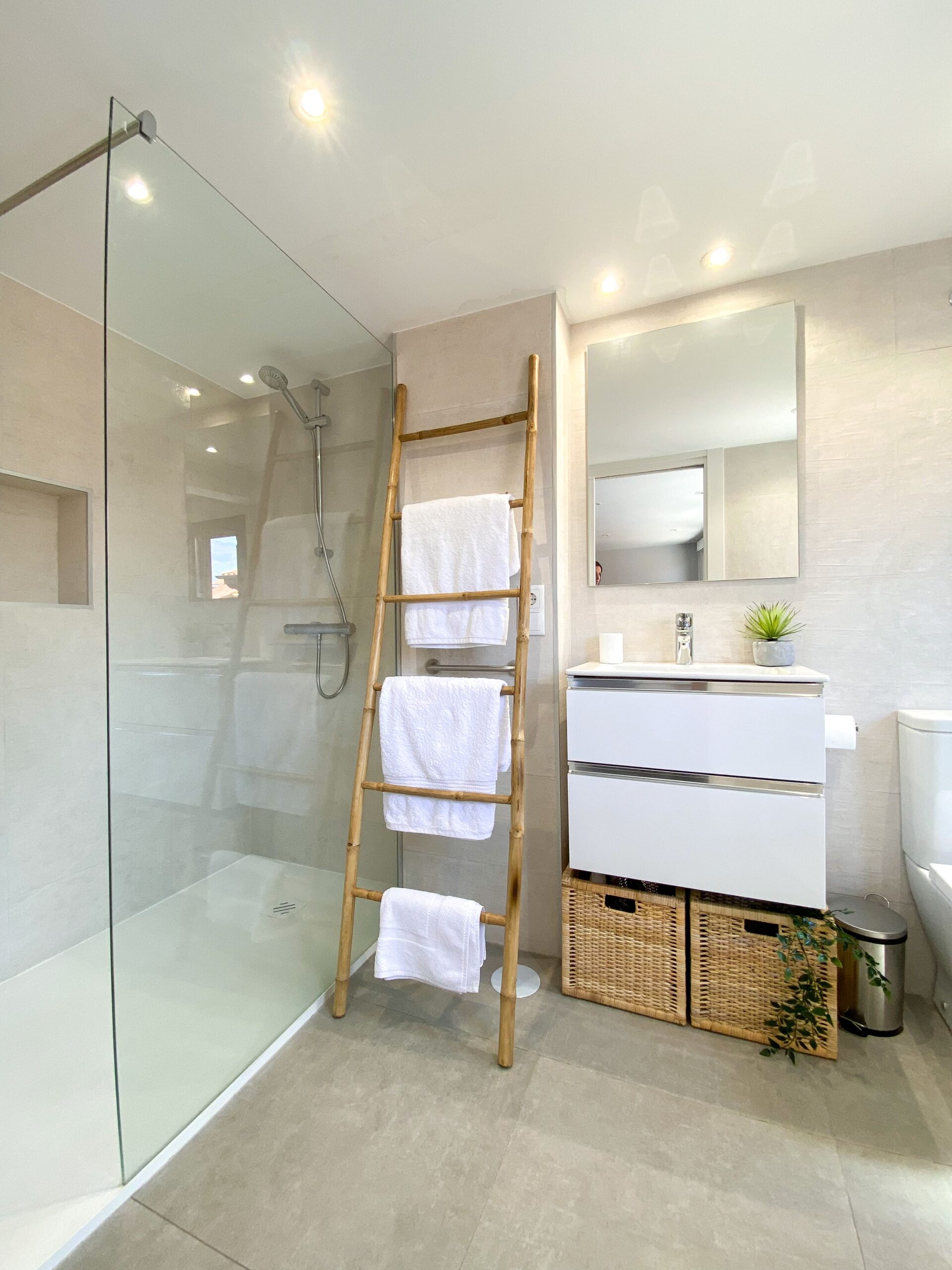 El apartamento cuenta con dos dormitorios —uno con cama de matrimonio y otro con dos camas individuales—, todos equipados con ropa de cama premium y amplios armarios empotrados. El salón, espacioso y lleno de luz natural, se integra con una cocina completamente equipada con electrodomésticos de alta gama, perfecta para disfrutar de comidas en familia o entre amigos.