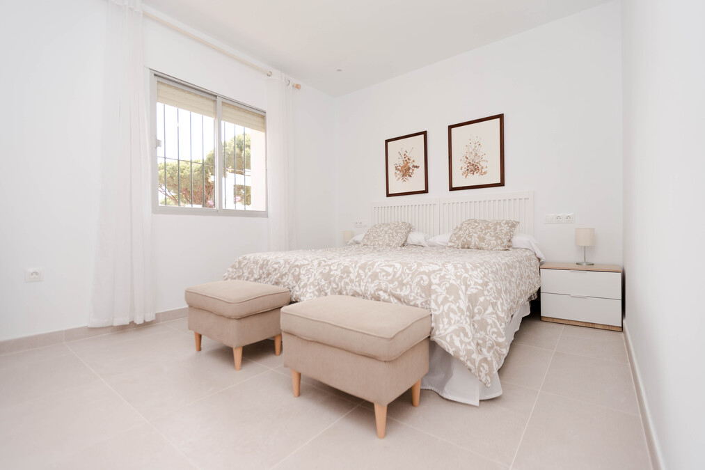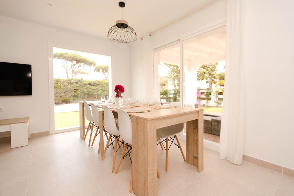 La cocina, abierta al salón, está completamente equipada con todo lo necesario para preparar tus platos favoritos mientras compartes gratos momentos en compañía. En el jardín, encontrarás una barbacoa de obra y un encantador porche amueblado con muebles de mimbre, donde podrás deleitarte con deliciosas comidas al aire libre y relajarte al máximo. Además, el jardín cuenta con cómodas hamacas junto a la piscina, donde podrás disfrutar del sol andaluz y desconectar por completo.
