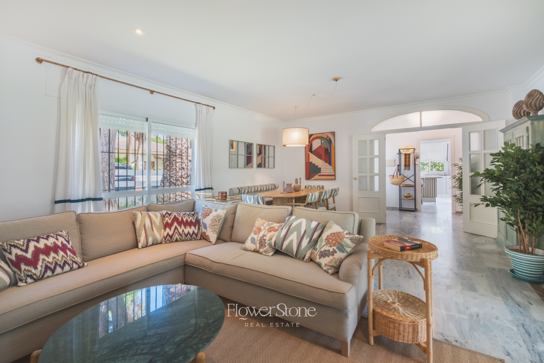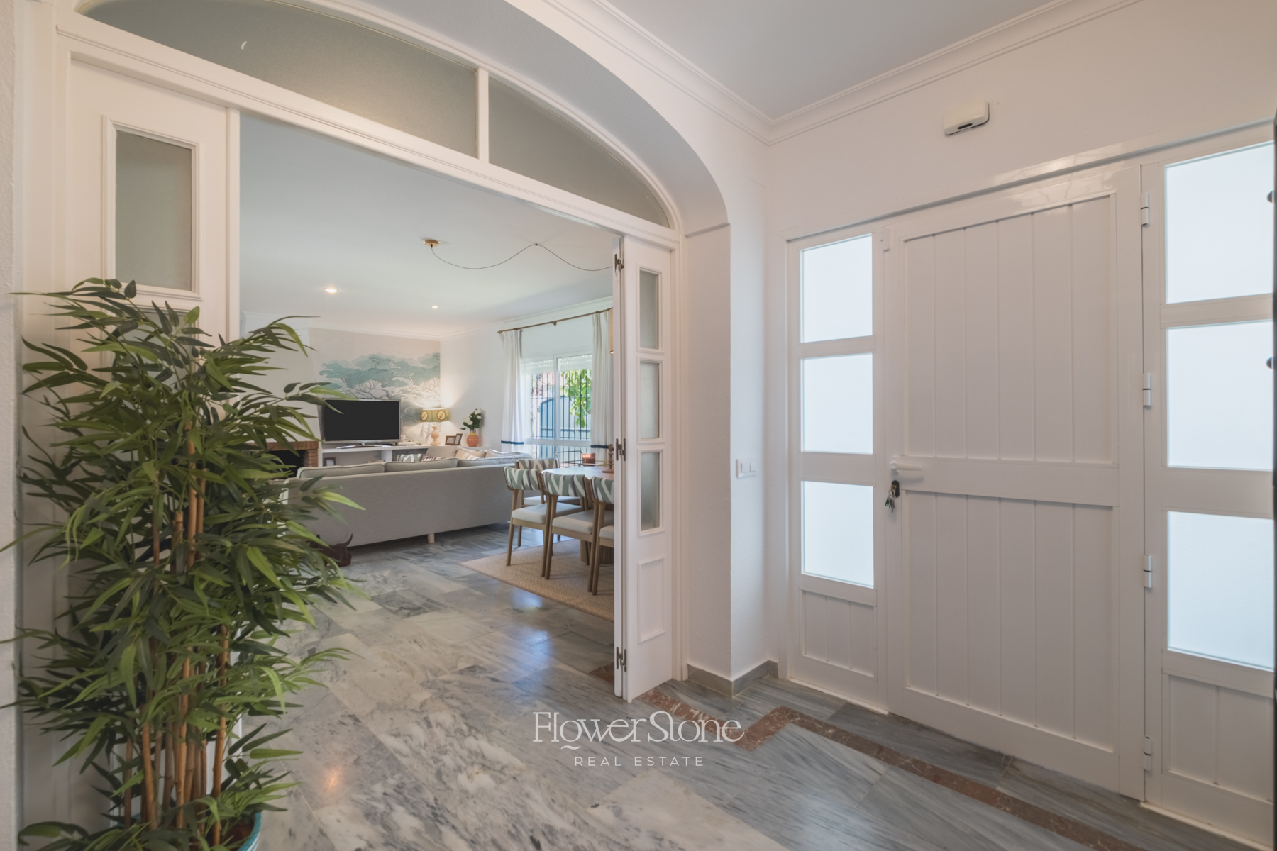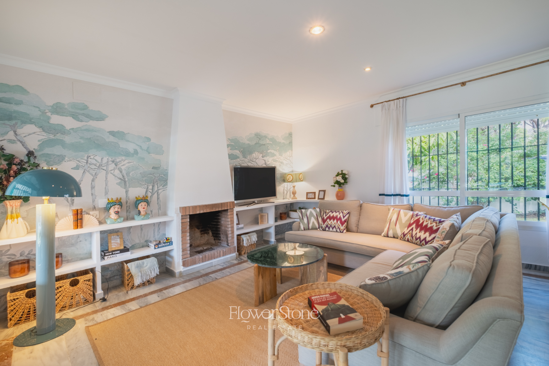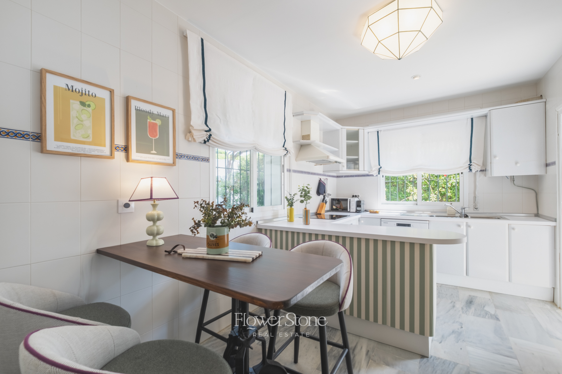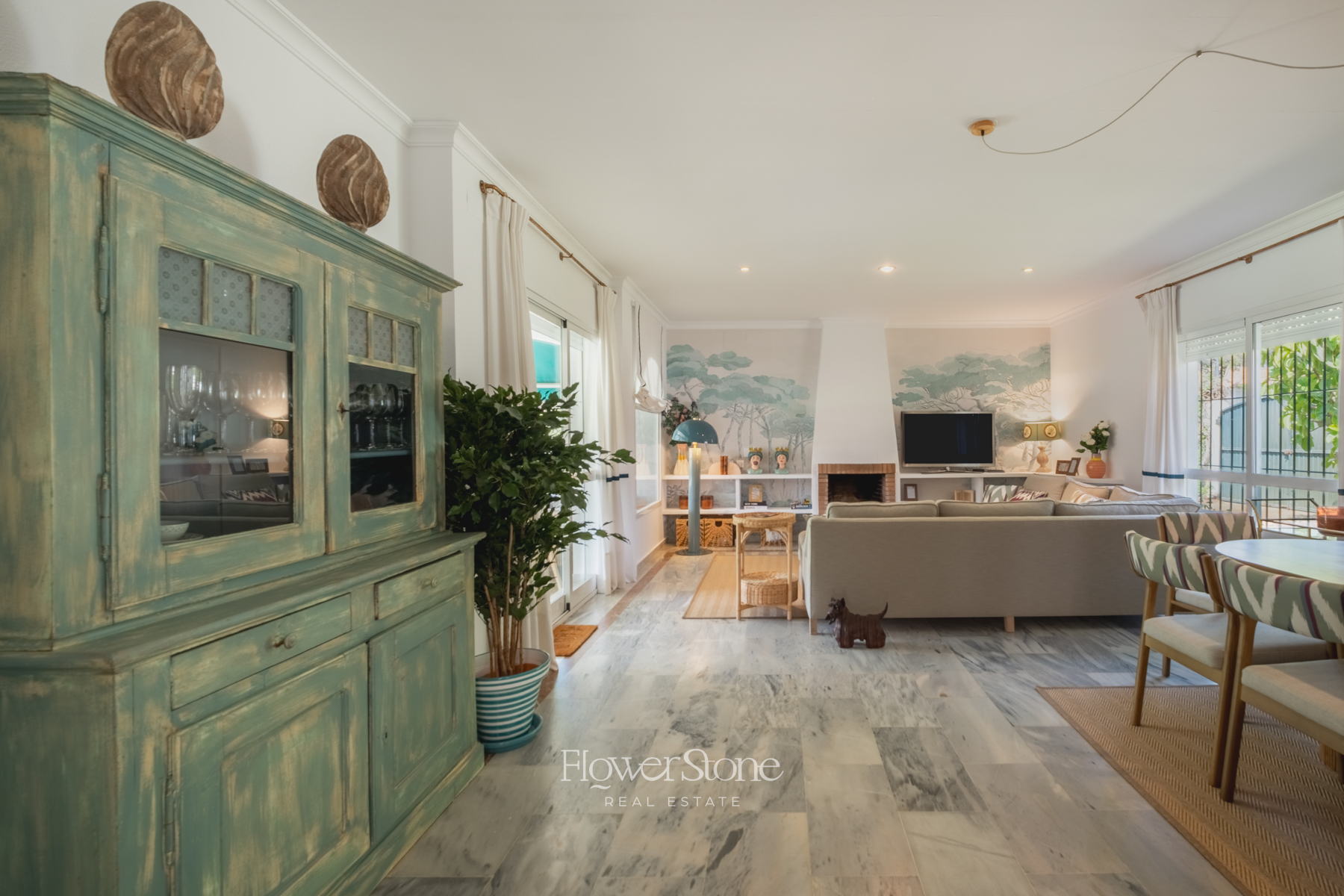 El exterior es el verdadero protagonista: un gran jardín privado con una piscina impresionante rodeada de césped y un porche amueblado, perfecto para desayunos al aire libre, tardes de relax o cenas bajo el cielo estrellado andaluz.
