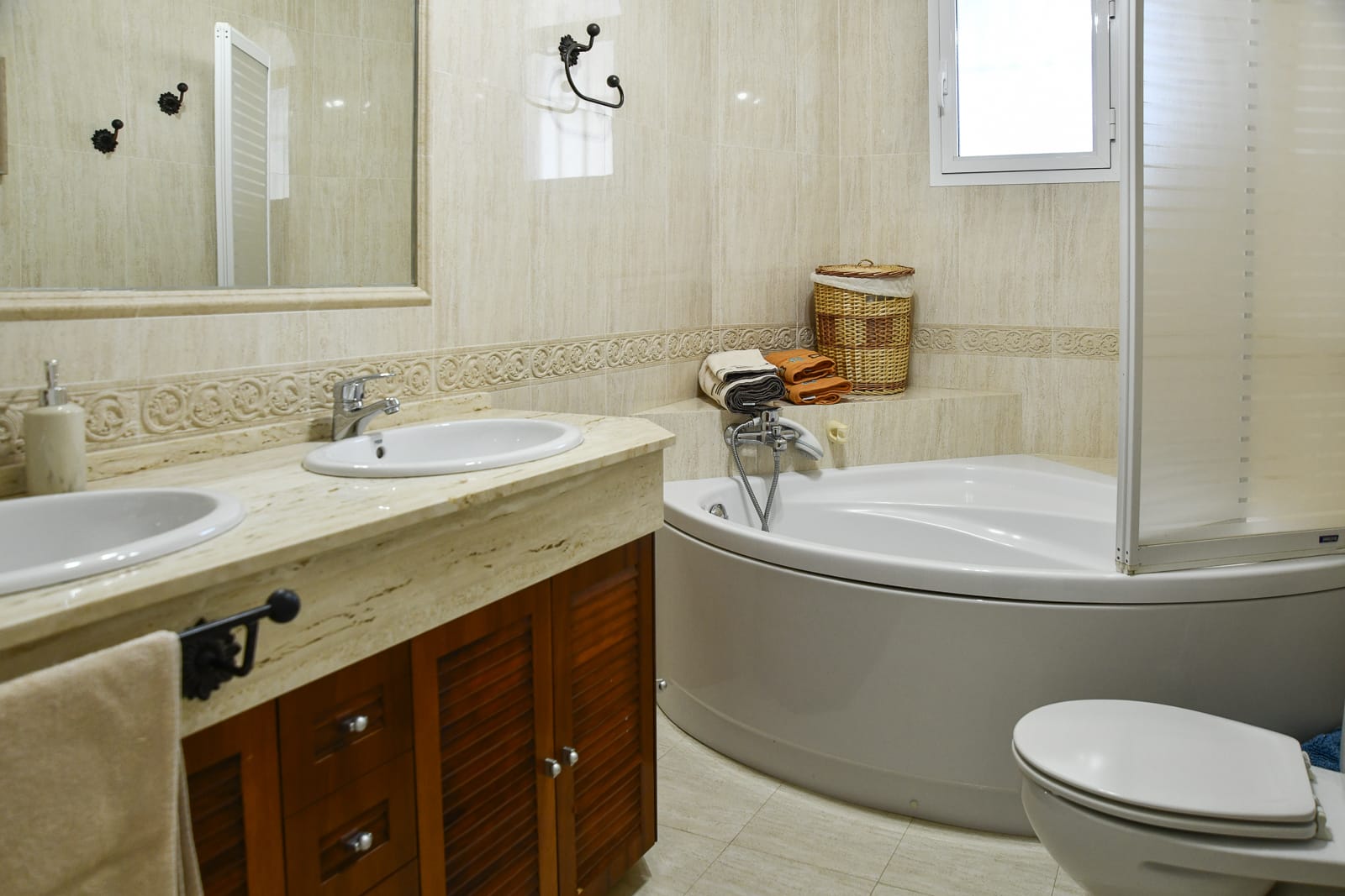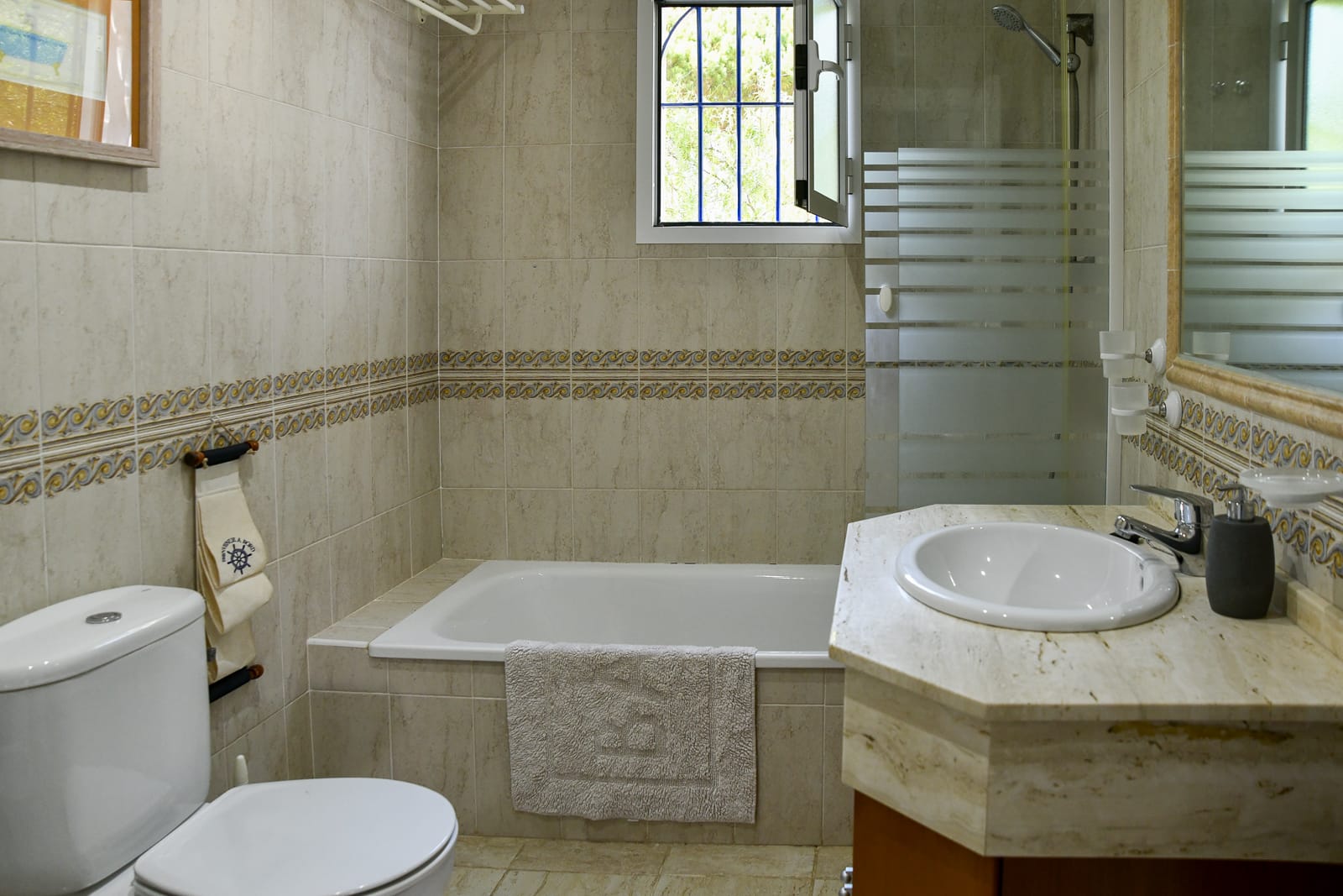 La vivienda cuenta con 6 dormitorios perfectamente distribuidos: tres habitaciones con dos camas individuales de 90 cm, un dormitorio principal con cama de 1,50 m y baño en suite con ducha, y dos dormitorios con cama de 1,35 m que además ofrecen la posibilidad de añadir sofá-cama de 90 cm. En total, dispone de 3 baños completos (dos con bañera y uno con ducha) y un aseo adicional, lo que la hace muy cómoda para grupos grandes.