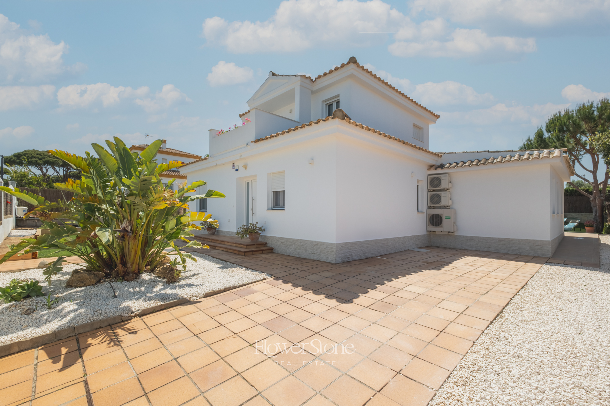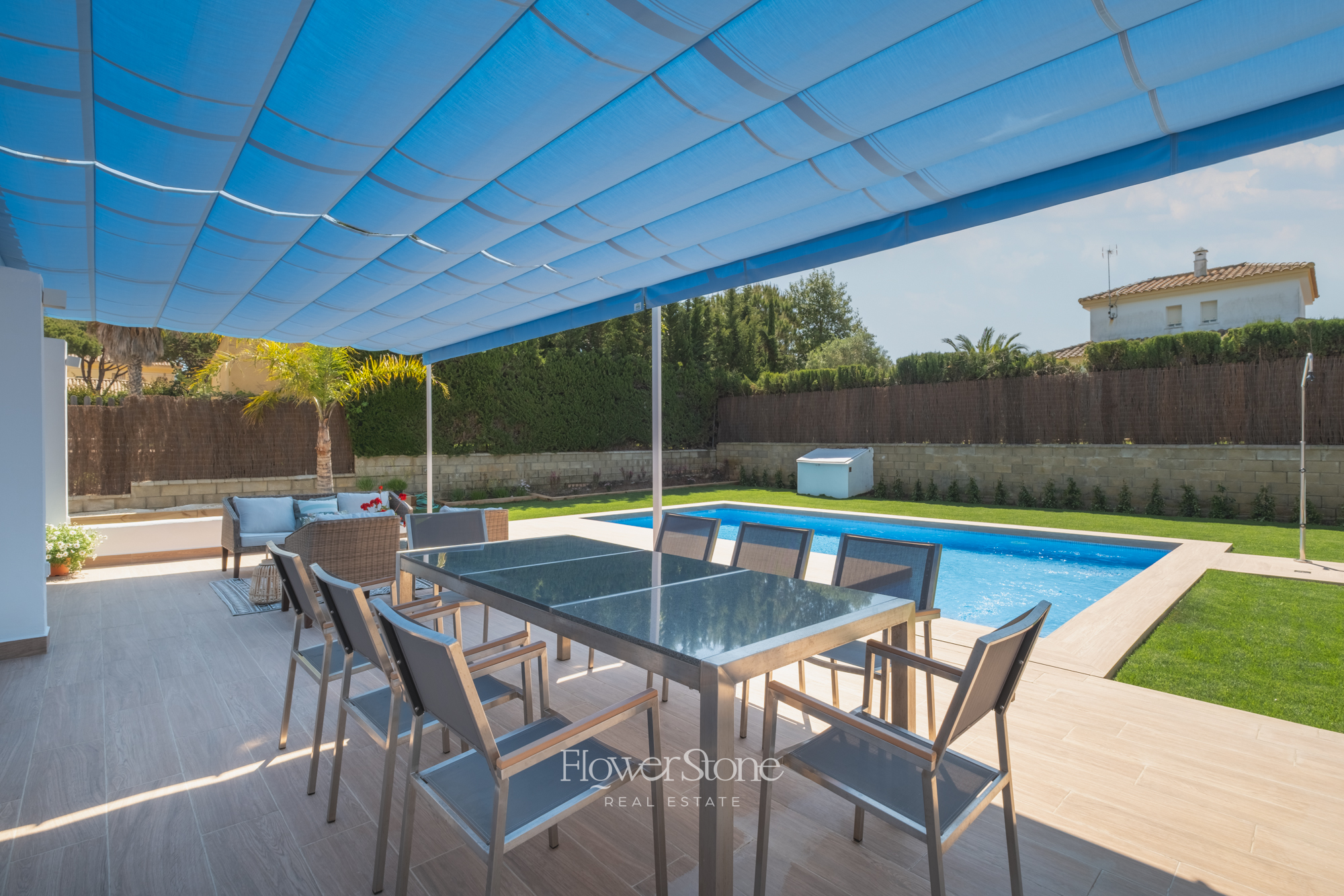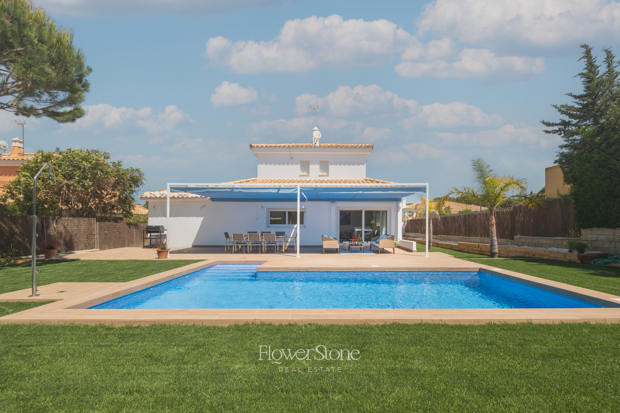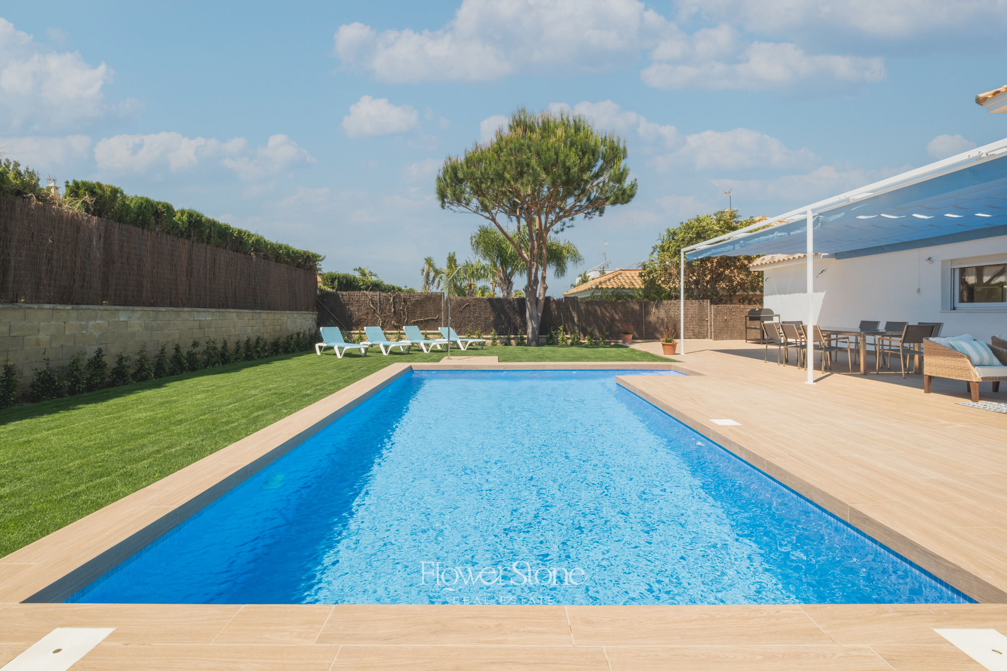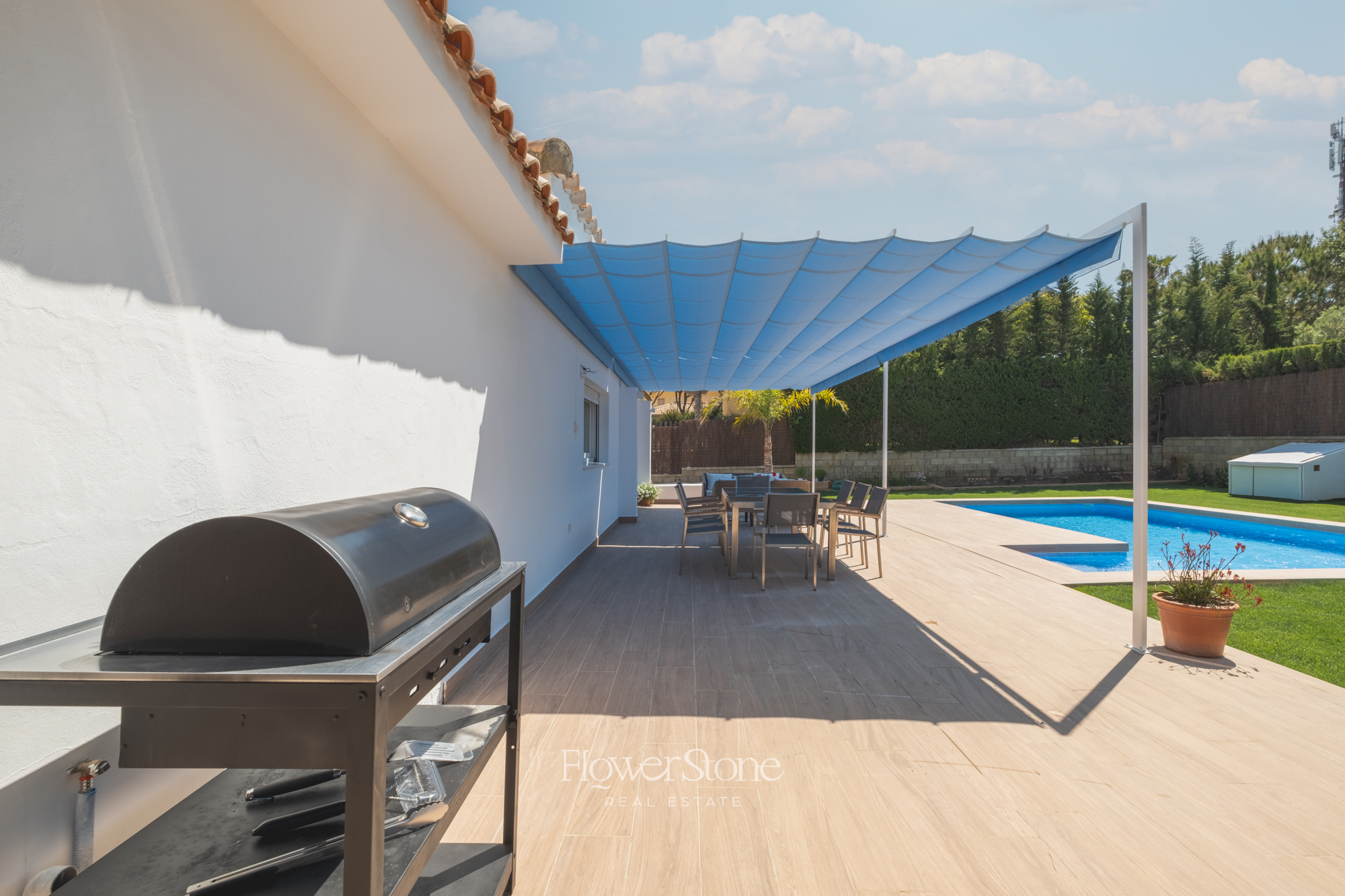 El exterior es uno de los grandes atractivos de la villa: un amplio jardín con piscina privada, ducha exterior y un porche amueblado perfecto para relajarse al aire libre. La climatización está garantizada con aire acondicionado y calefacción centralizados en la planta baja, y splits individuales en cada dormitorio de la planta alta.