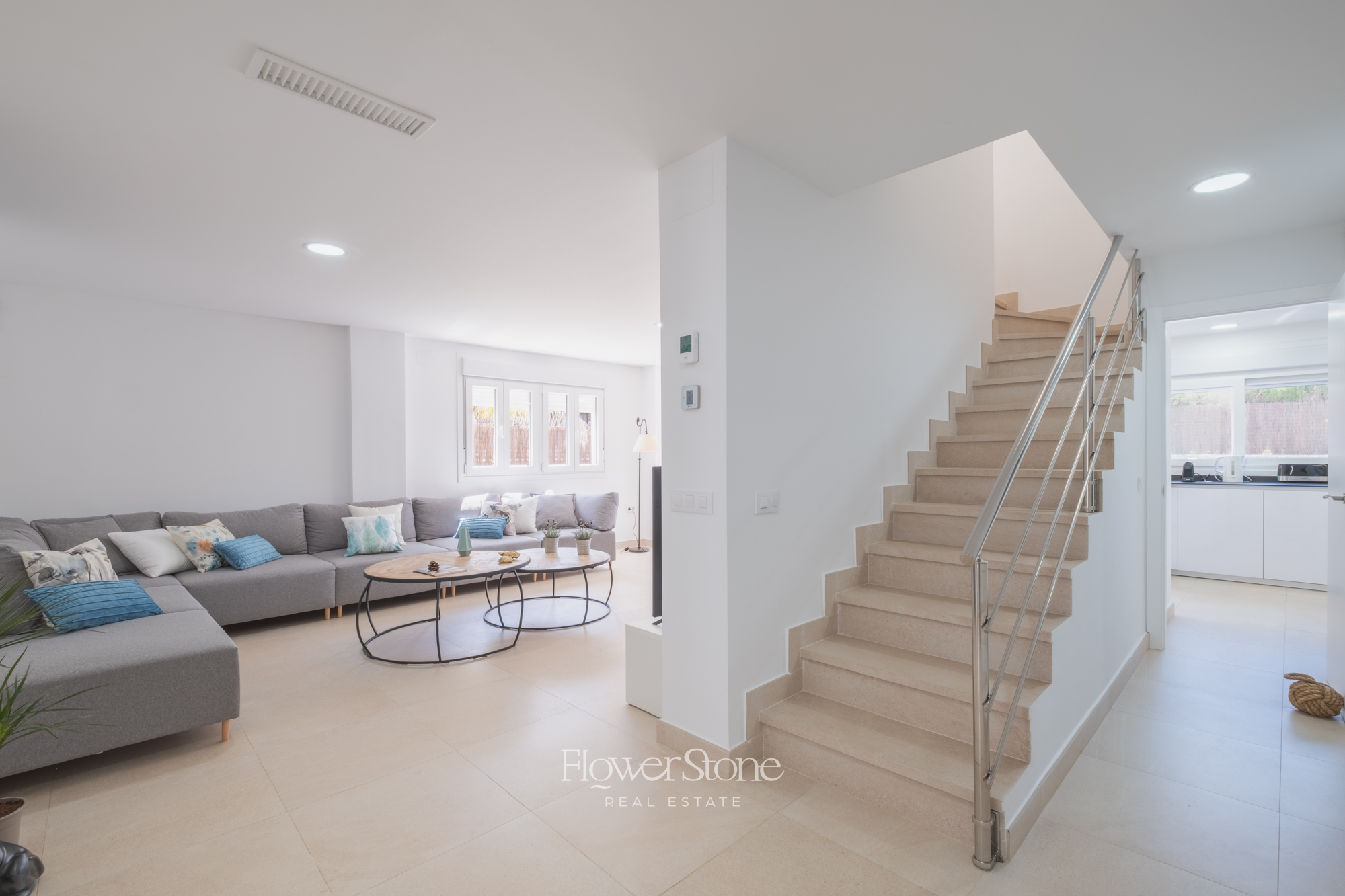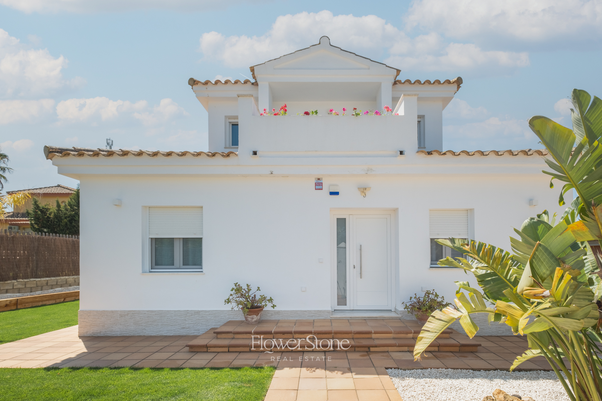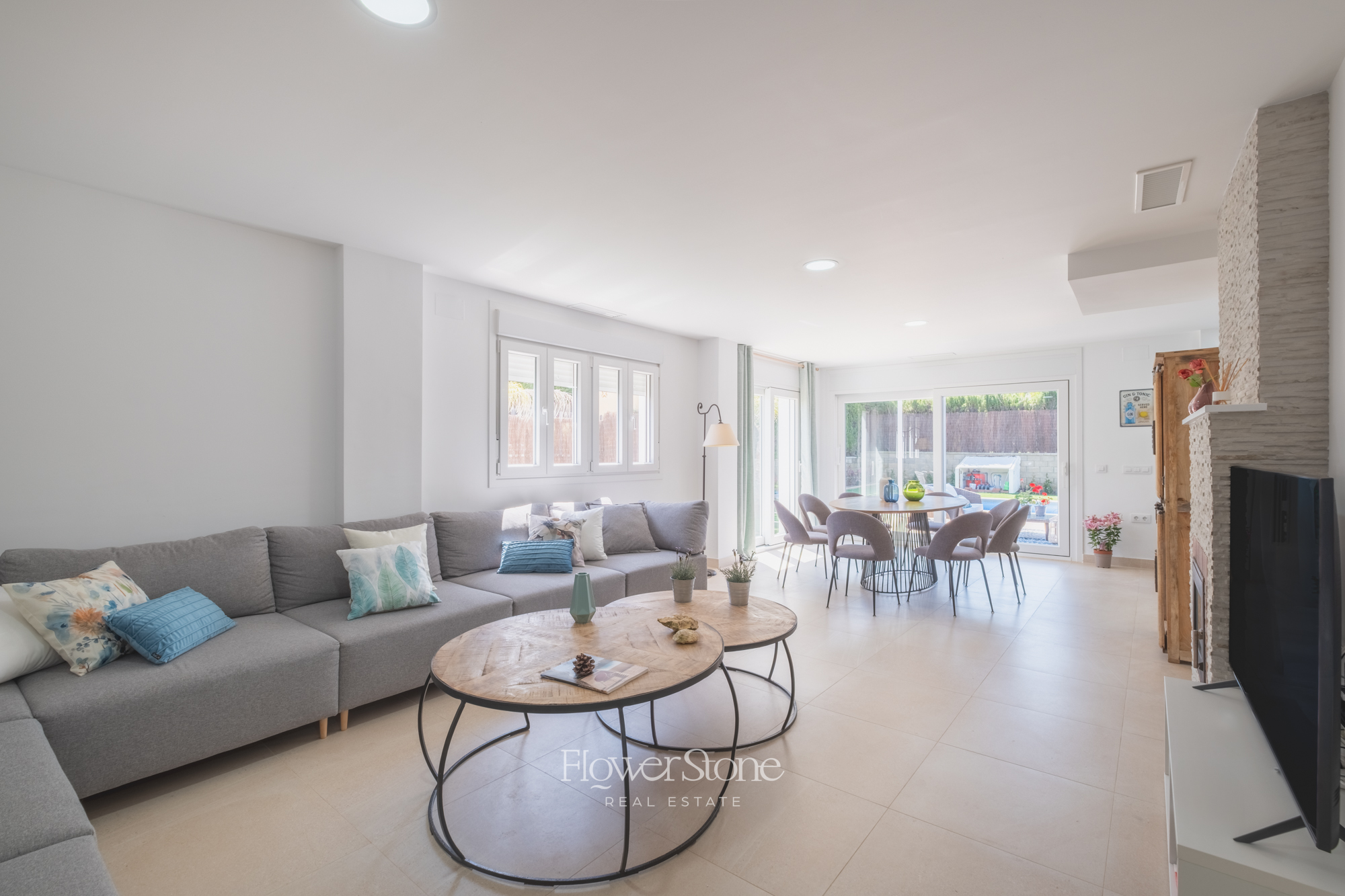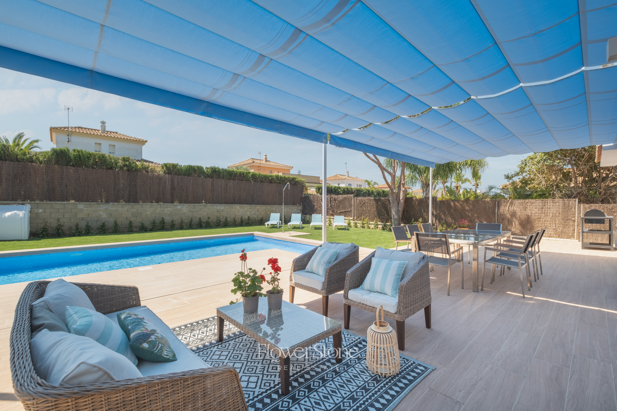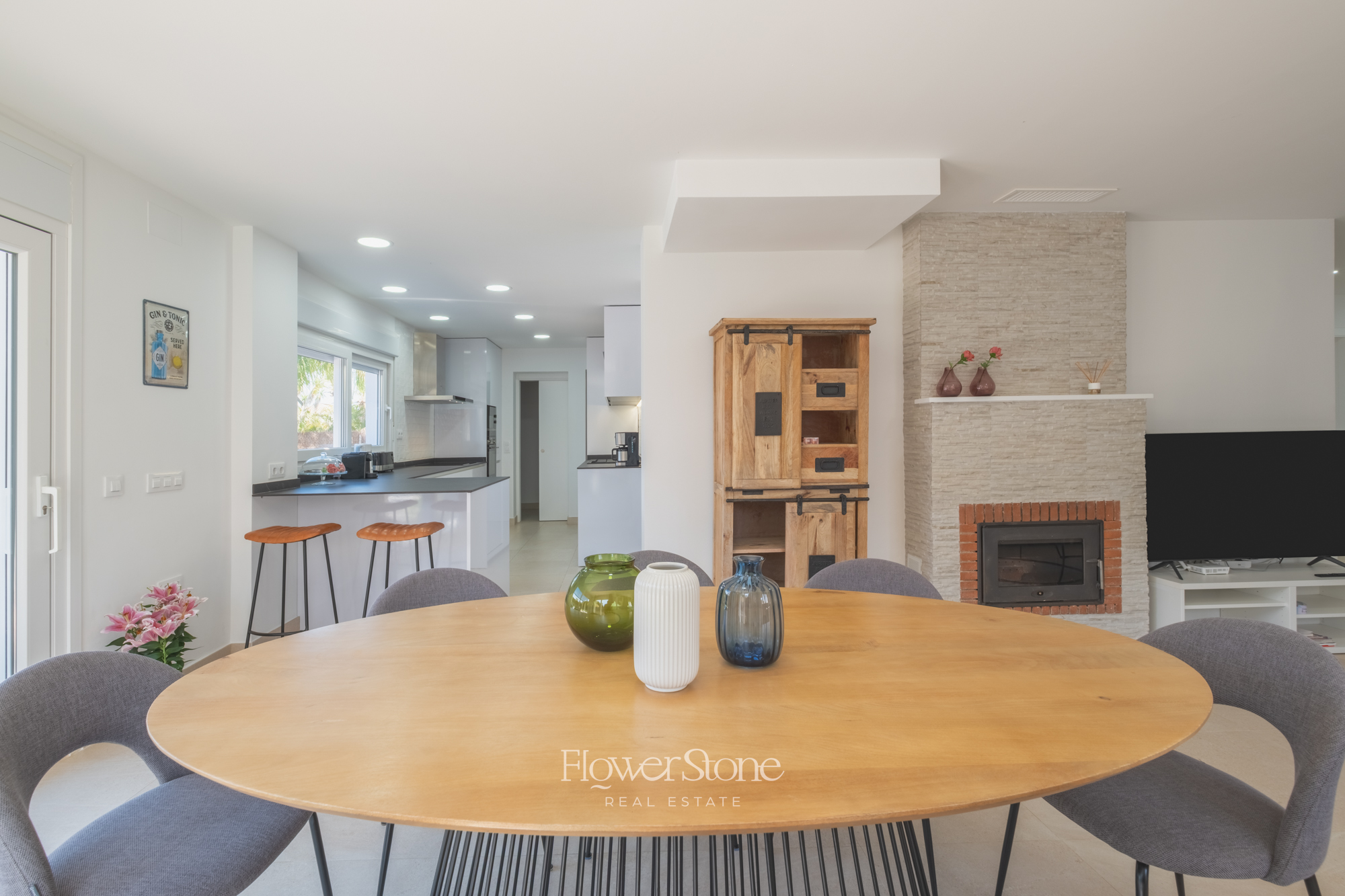 El exterior es uno de los grandes atractivos de la villa: un amplio jardín con piscina privada, ducha exterior y un porche amueblado perfecto para relajarse al aire libre. La climatización está garantizada con aire acondicionado y calefacción centralizados en la planta baja, y splits individuales en cada dormitorio de la planta alta.