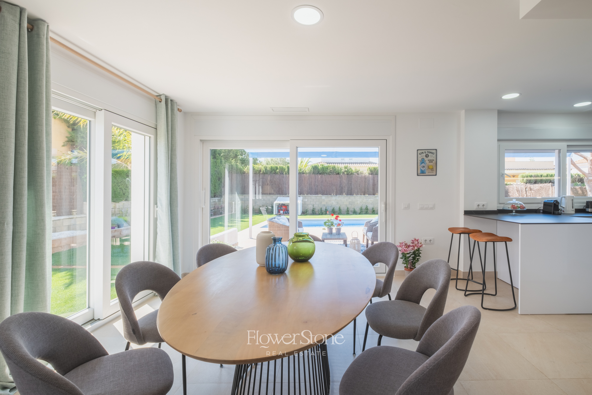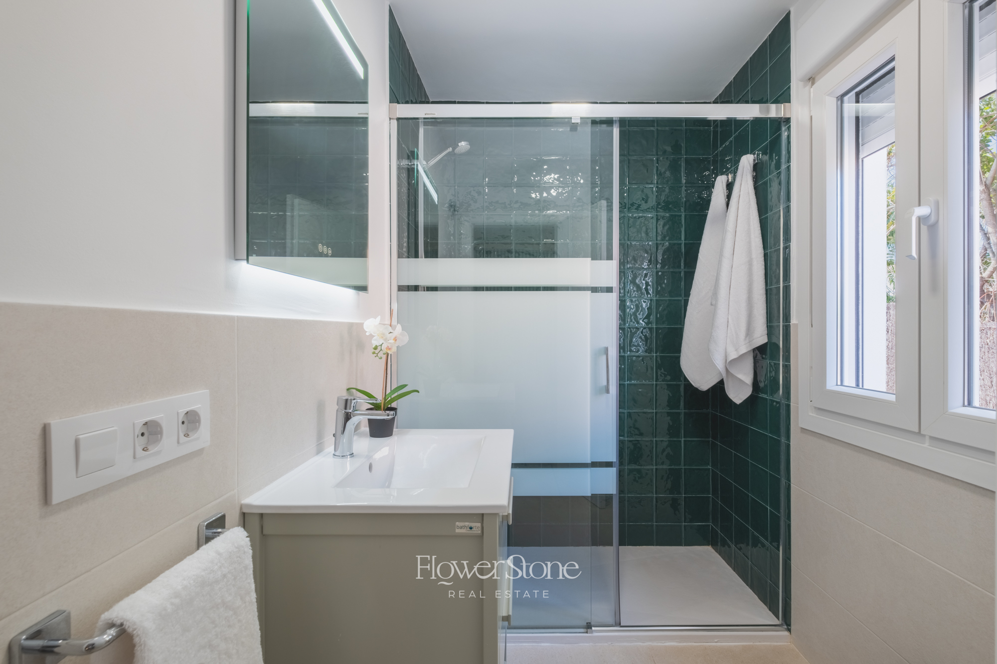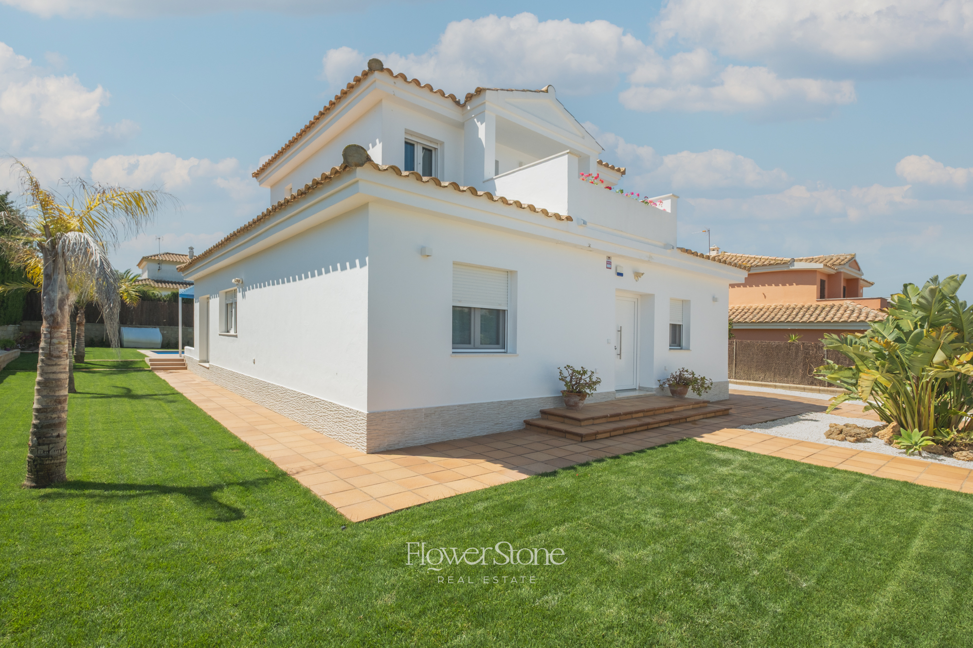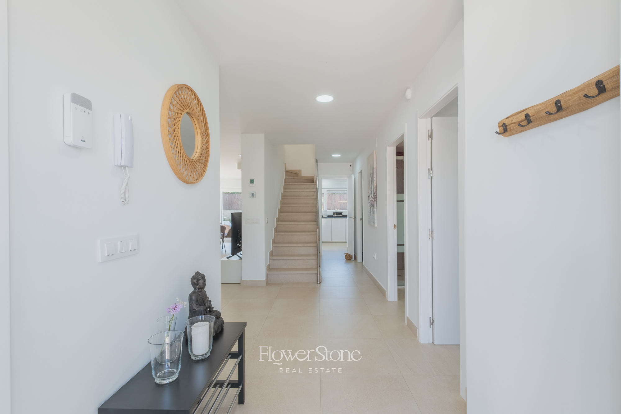 El exterior es uno de los grandes atractivos de la villa: un amplio jardín con piscina privada, ducha exterior y un porche amueblado perfecto para relajarse al aire libre. La climatización está garantizada con aire acondicionado y calefacción centralizados en la planta baja, y splits individuales en cada dormitorio de la planta alta.