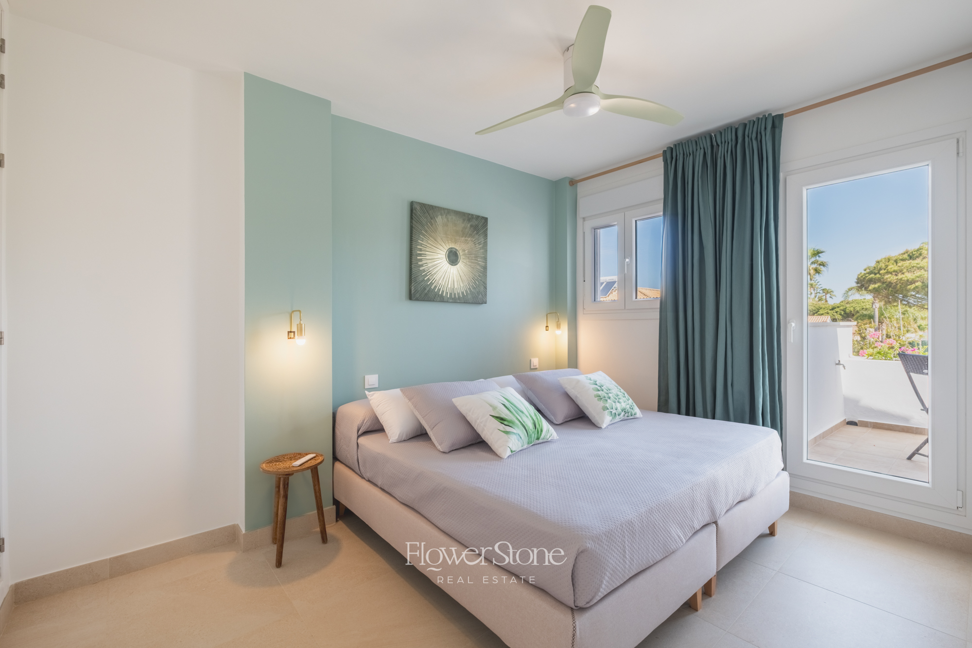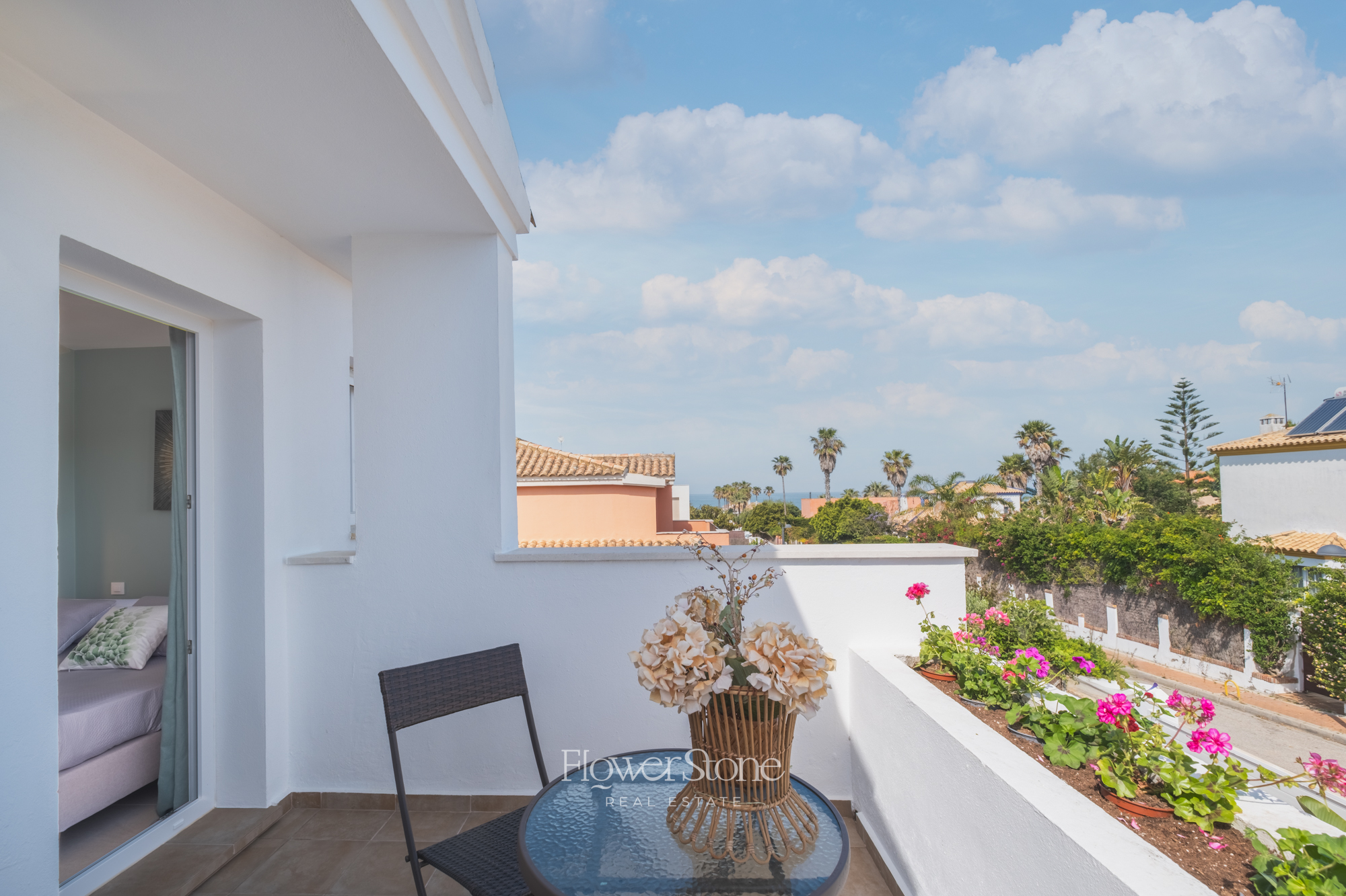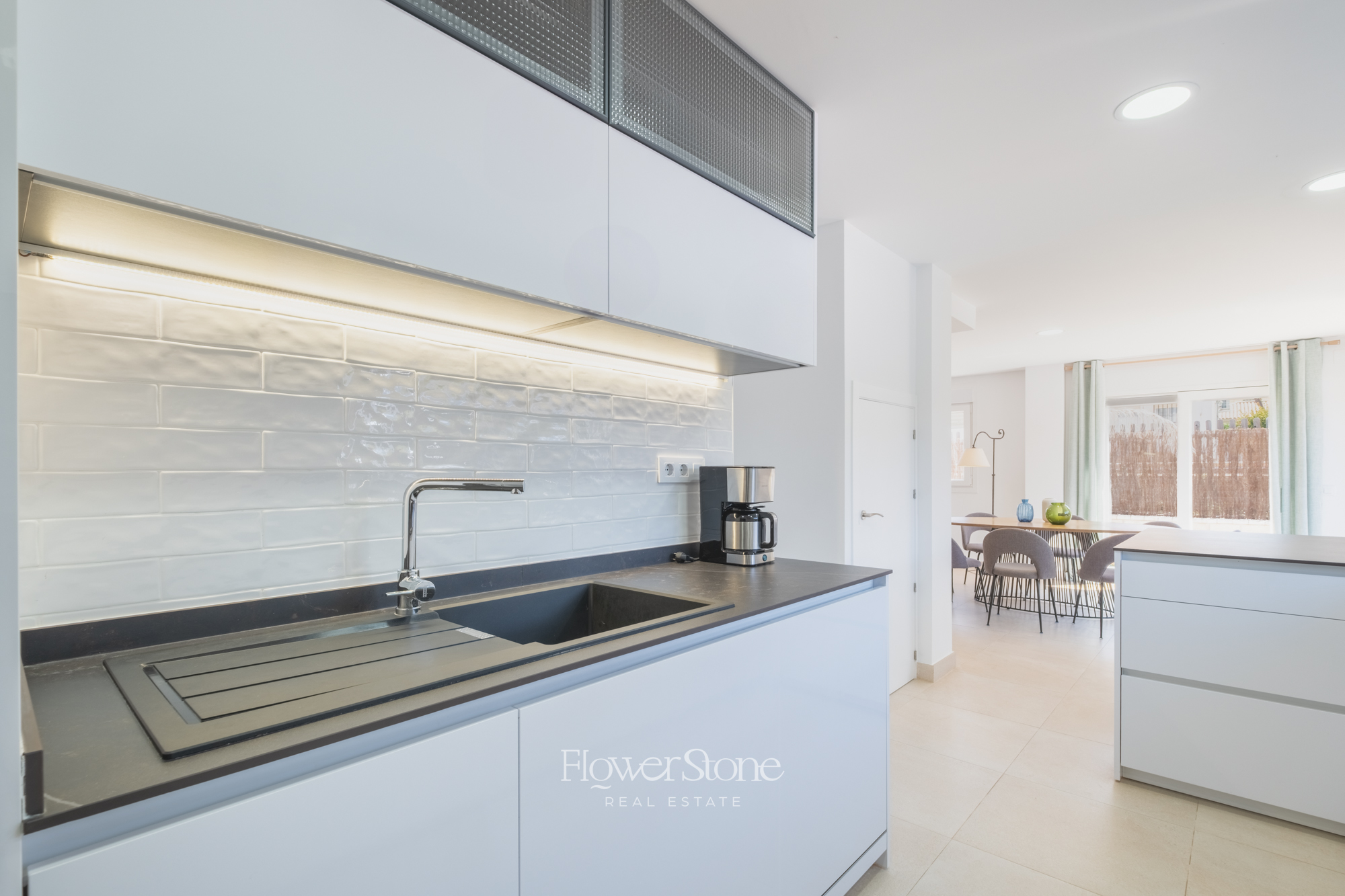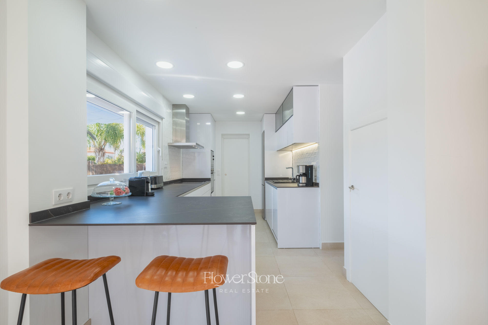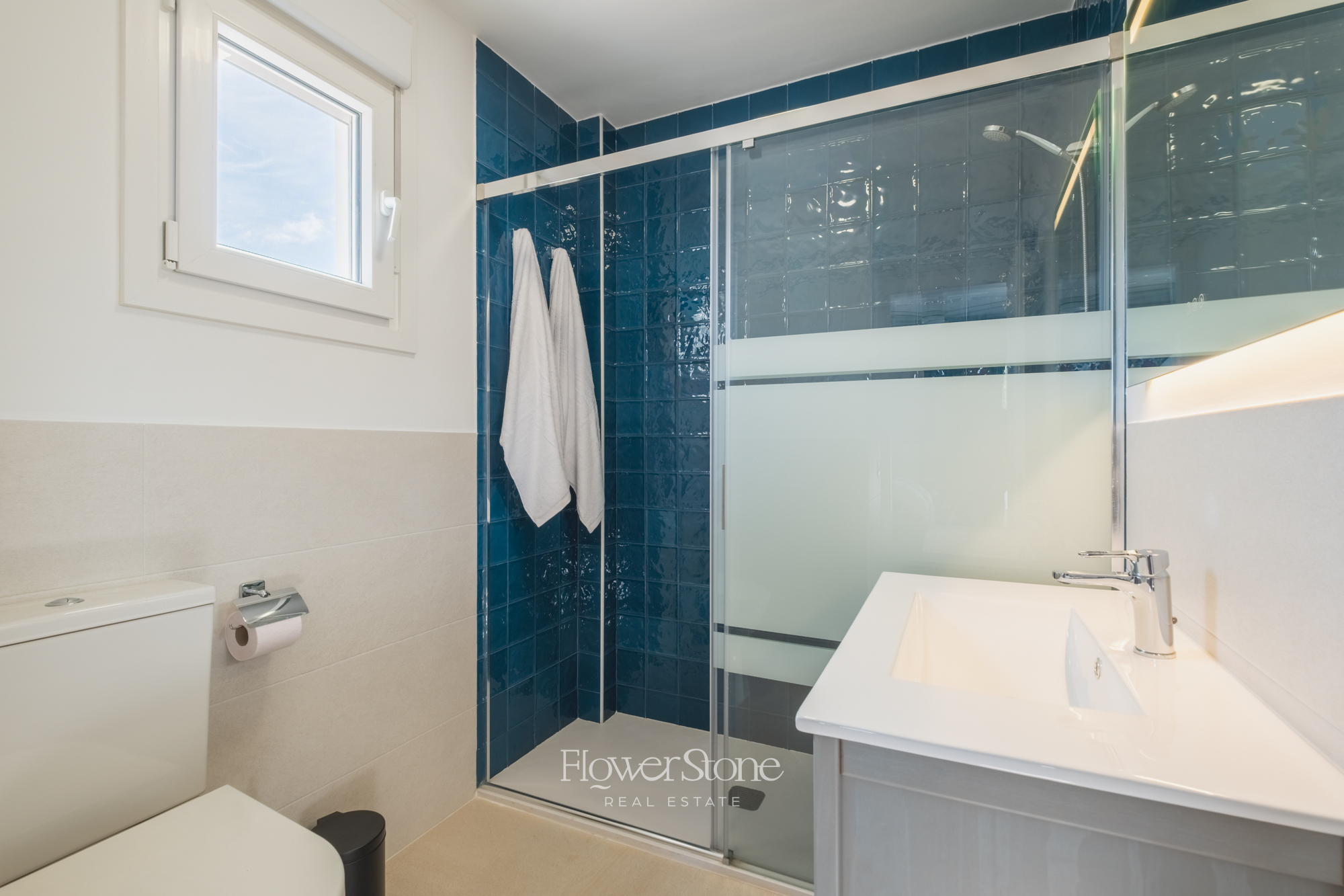 El exterior es uno de los grandes atractivos de la villa: un amplio jardín con piscina privada, ducha exterior y un porche amueblado perfecto para relajarse al aire libre. La climatización está garantizada con aire acondicionado y calefacción centralizados en la planta baja, y splits individuales en cada dormitorio de la planta alta.