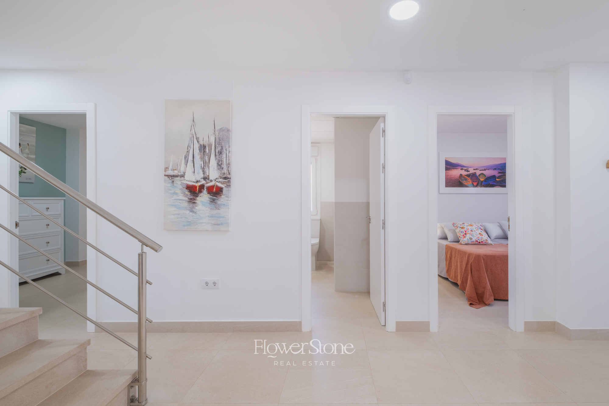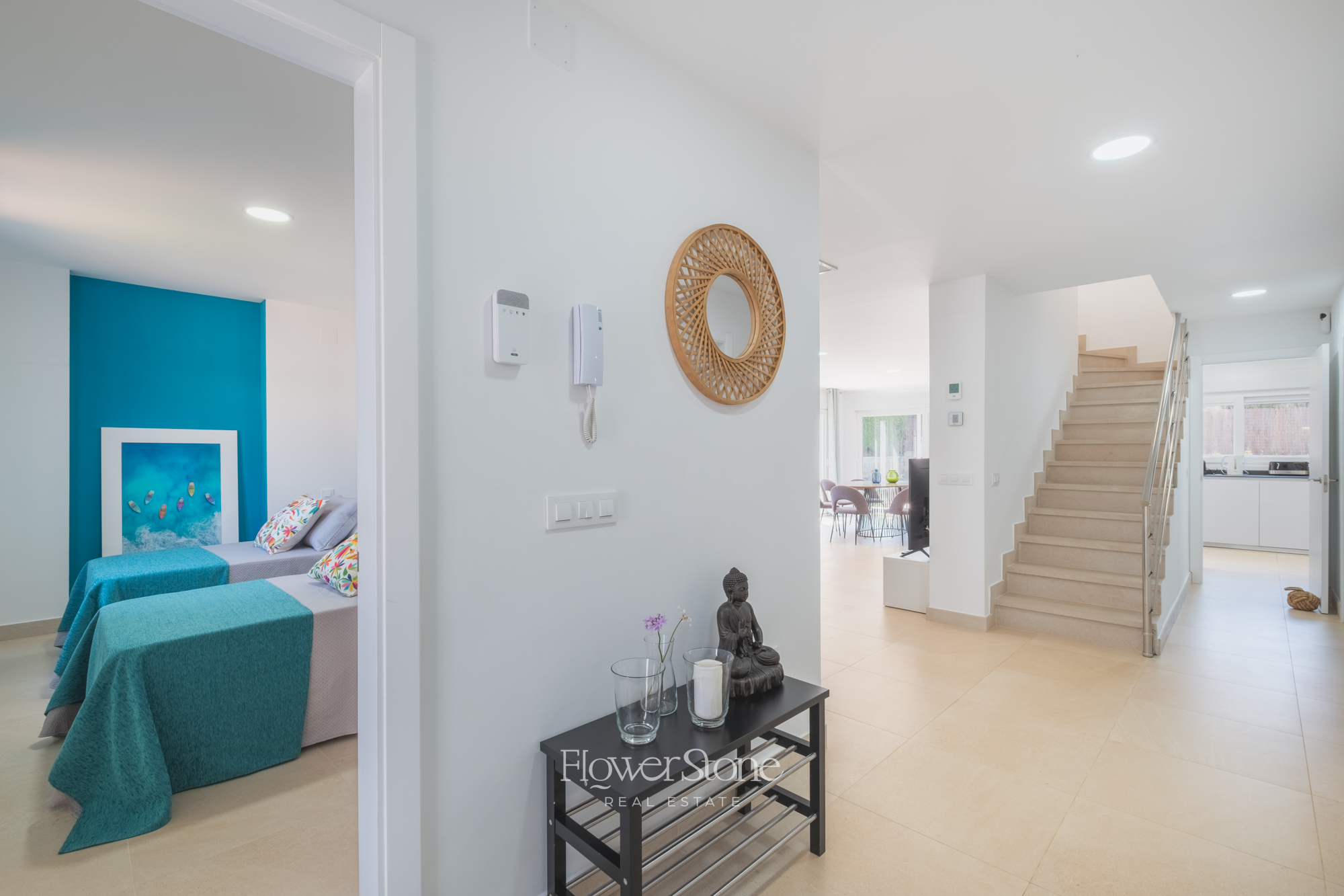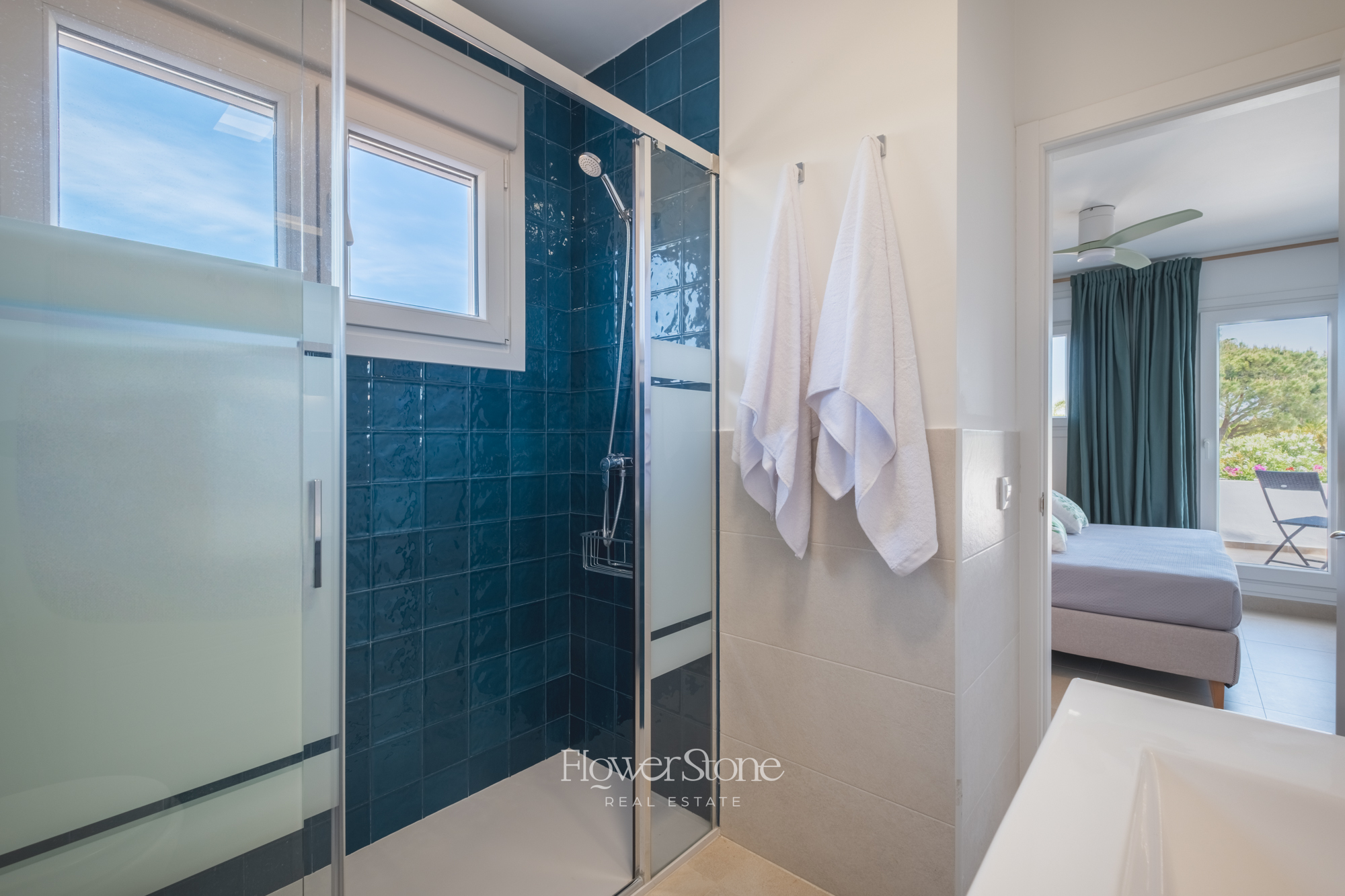 La villa tiene capacidad para 10 personas y está distribuida en dos plantas, ofreciendo espacios amplios, luminosos y perfectamente equipados para disfrutar en familia o con amigos. En la planta baja se encuentran tres dormitorios y dos baños, uno de ellos en suite. El dormitorio principal cuenta con una cama de 180 cm y baño privado con ducha y secador. También hay un dormitorio con dos camas de 90 cm unidas como cama doble, y un tercer dormitorio adicional, junto a un segundo baño completo con ducha.