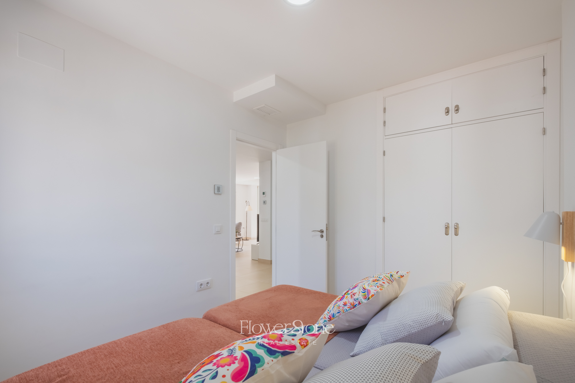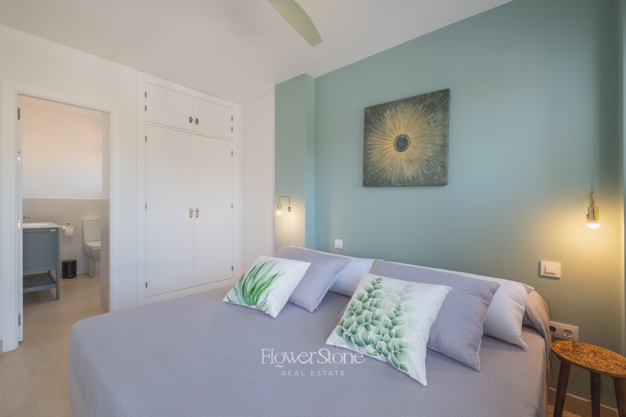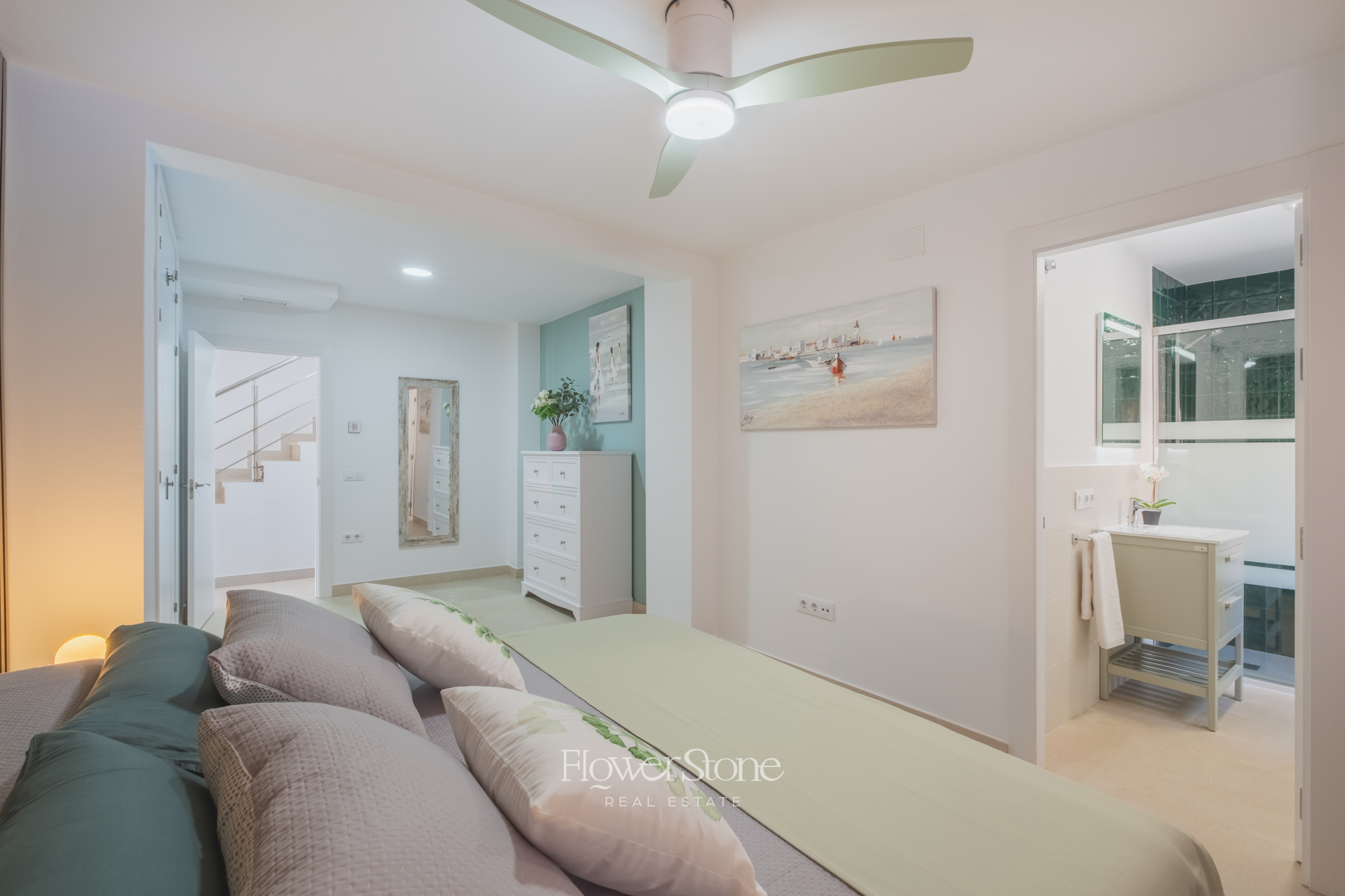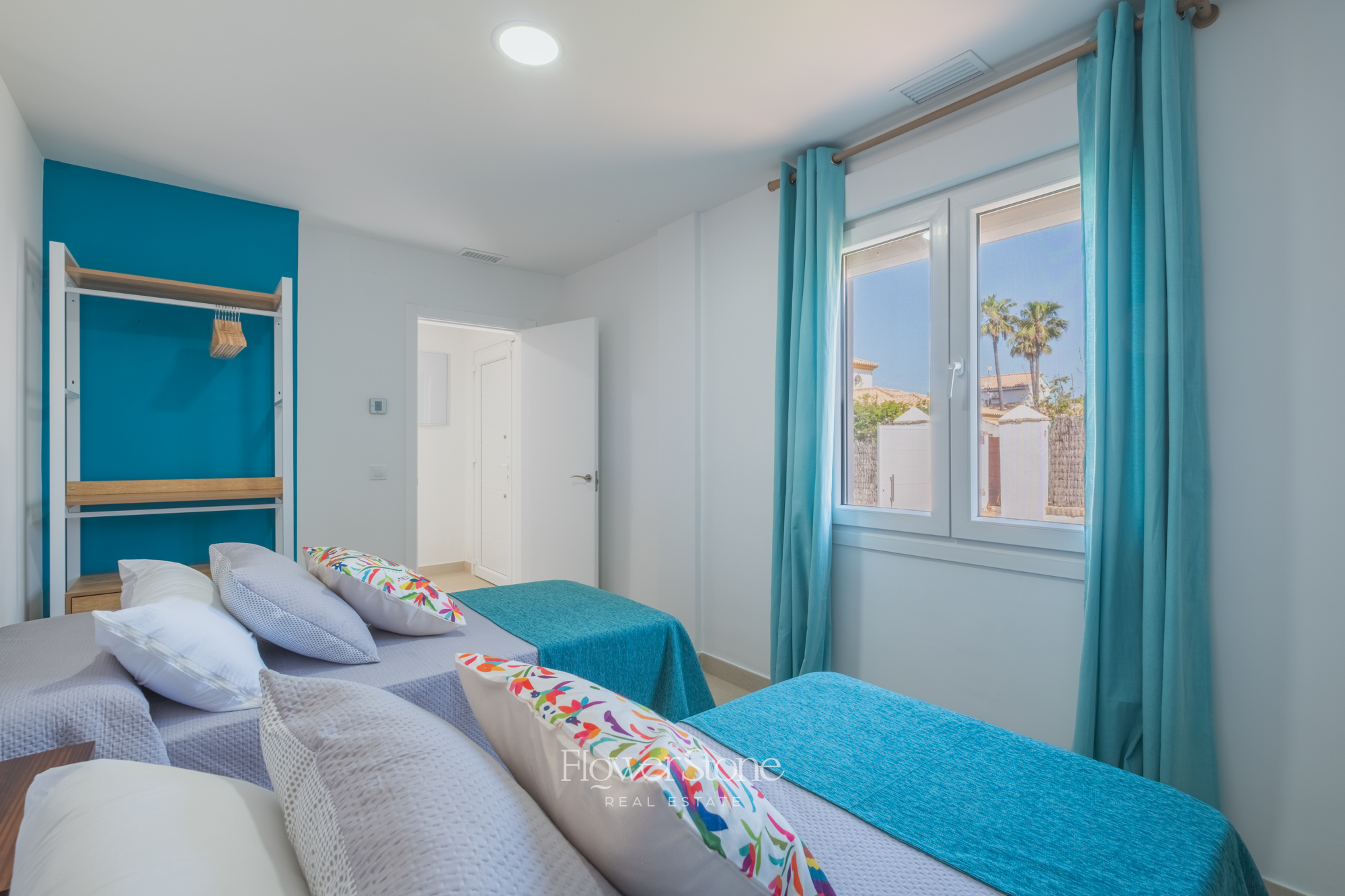 La villa tiene capacidad para 10 personas y está distribuida en dos plantas, ofreciendo espacios amplios, luminosos y perfectamente equipados para disfrutar en familia o con amigos. En la planta baja se encuentran tres dormitorios y dos baños, uno de ellos en suite. El dormitorio principal cuenta con una cama de 180 cm y baño privado con ducha y secador. También hay un dormitorio con dos camas de 90 cm unidas como cama doble, y un tercer dormitorio adicional, junto a un segundo baño completo con ducha.