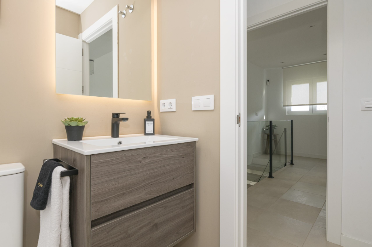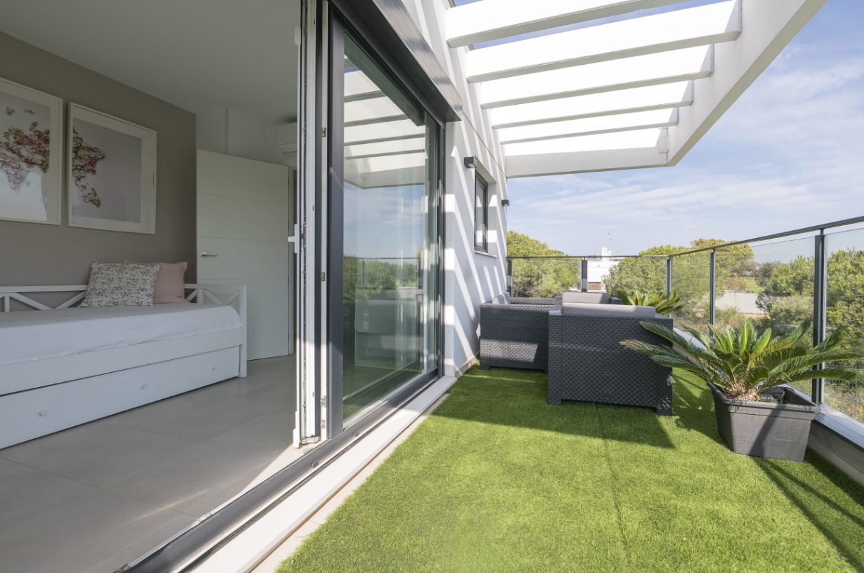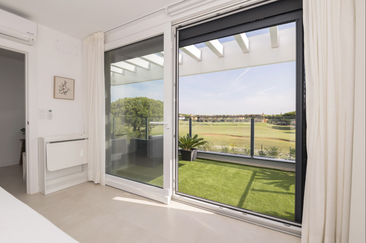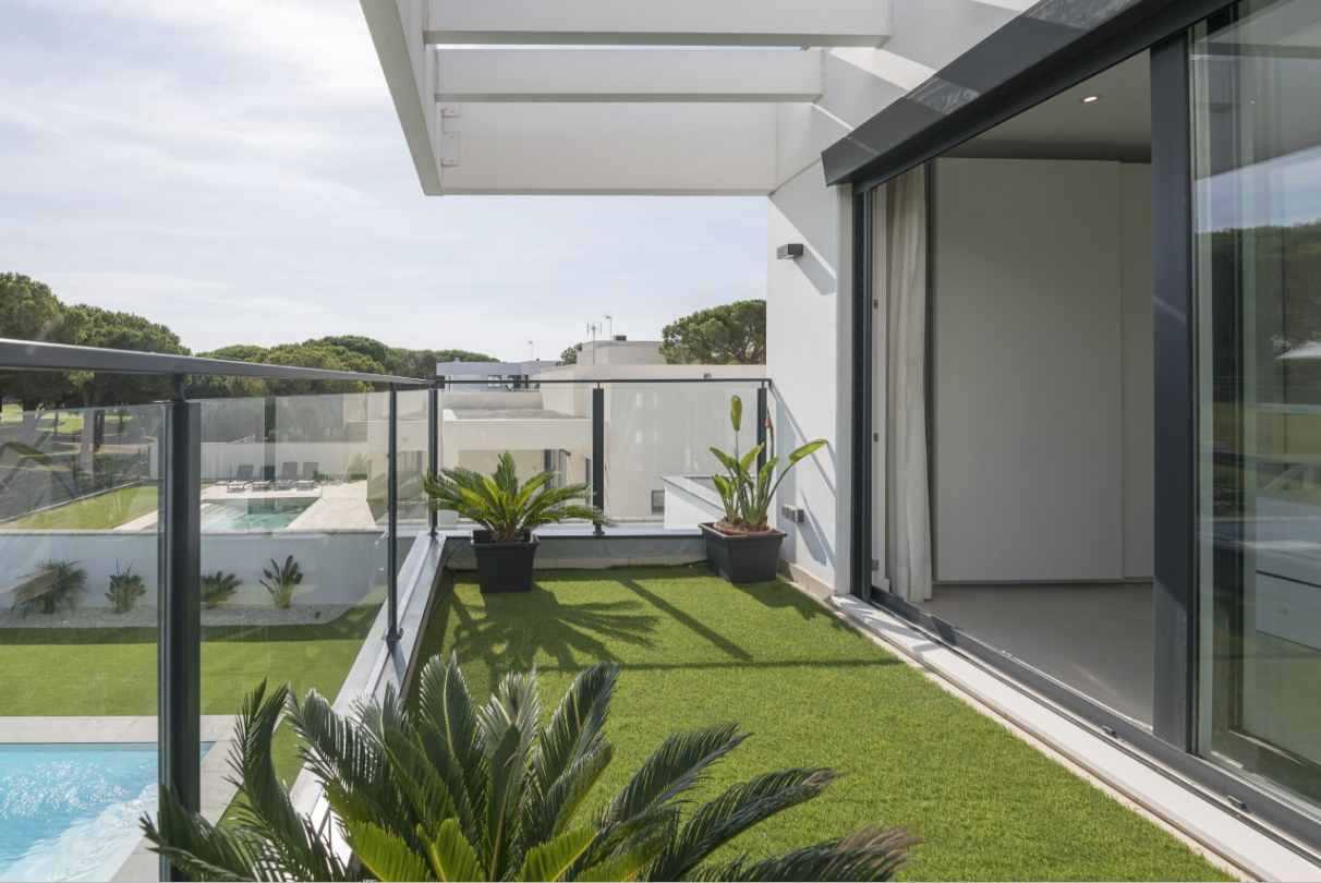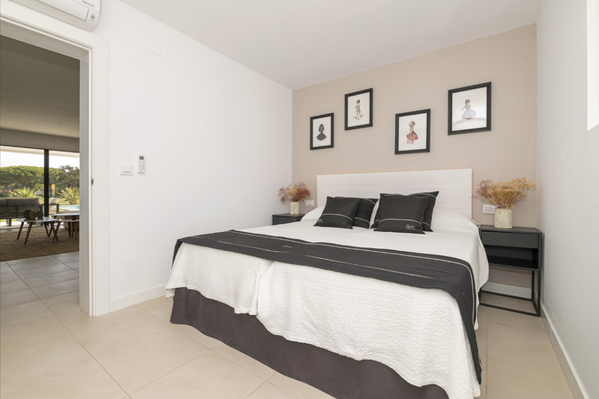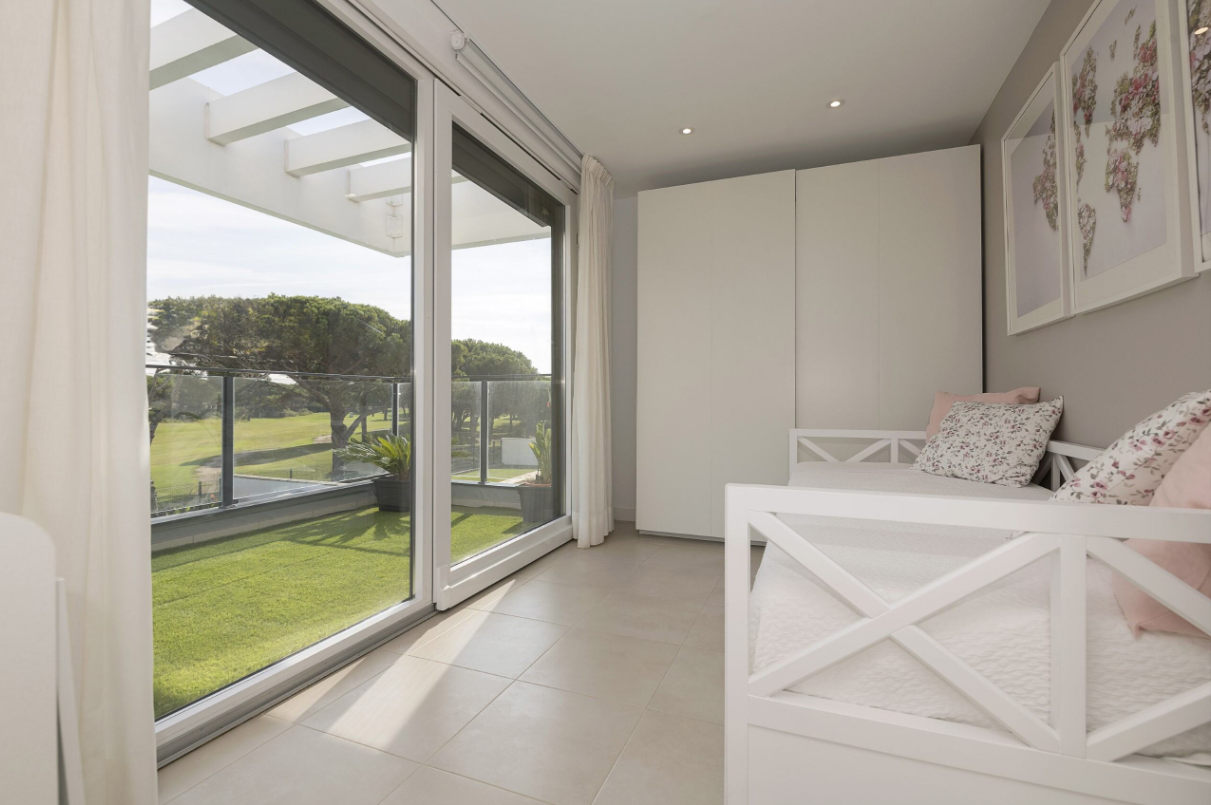 En la planta superior se distribuyen dos dormitorios dobles adicionales. Uno de ellos cuenta con baño en suite y el otro dispone de cama nido y acceso directo a un encantador porche con salón exterior, desde donde podrás disfrutar de vistas al hoyo 5 del campo de golf Sancti Petri Hills y a la parcela privada.