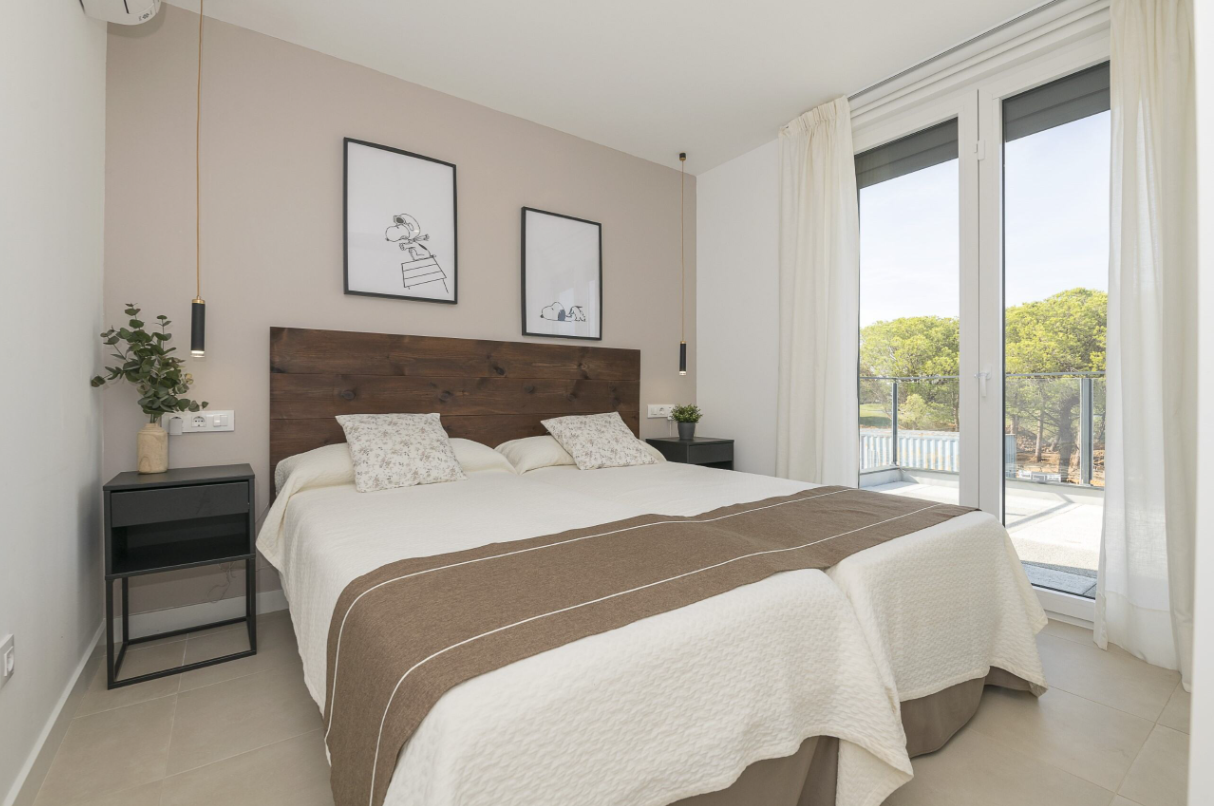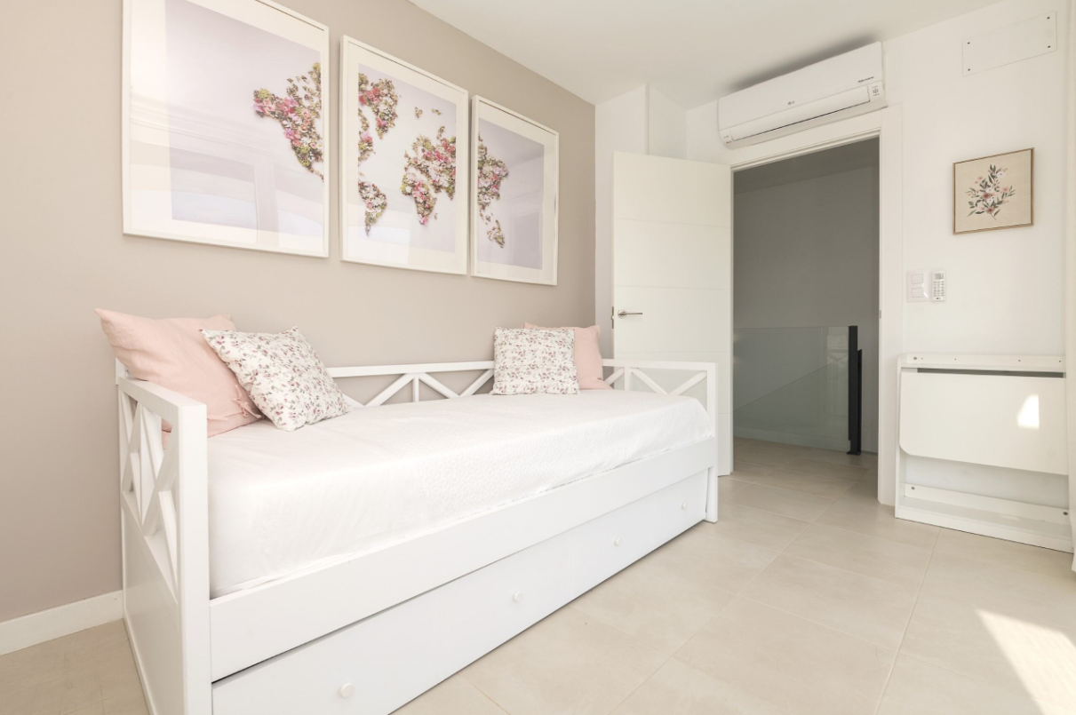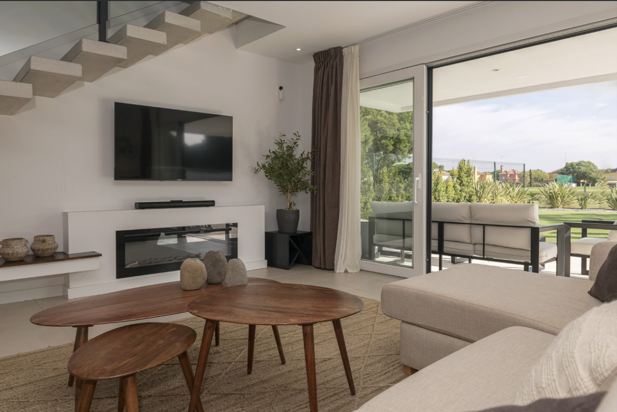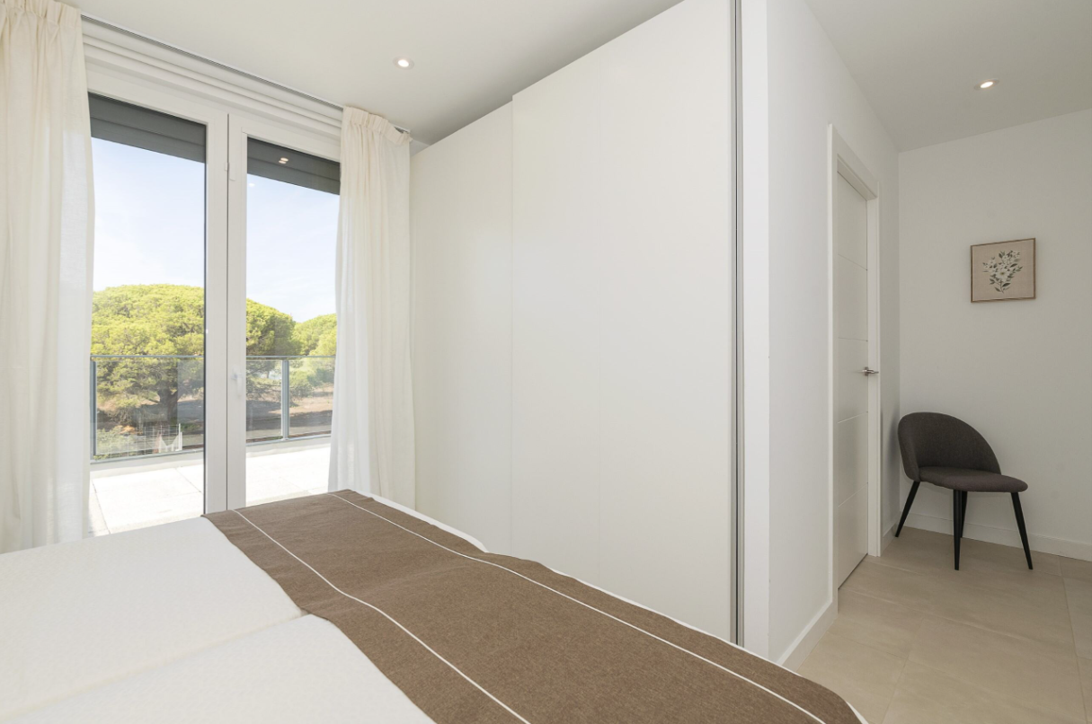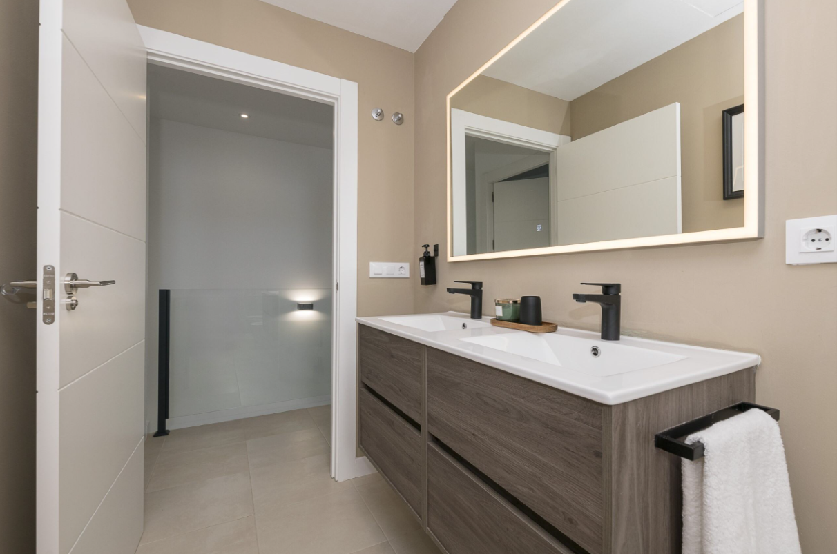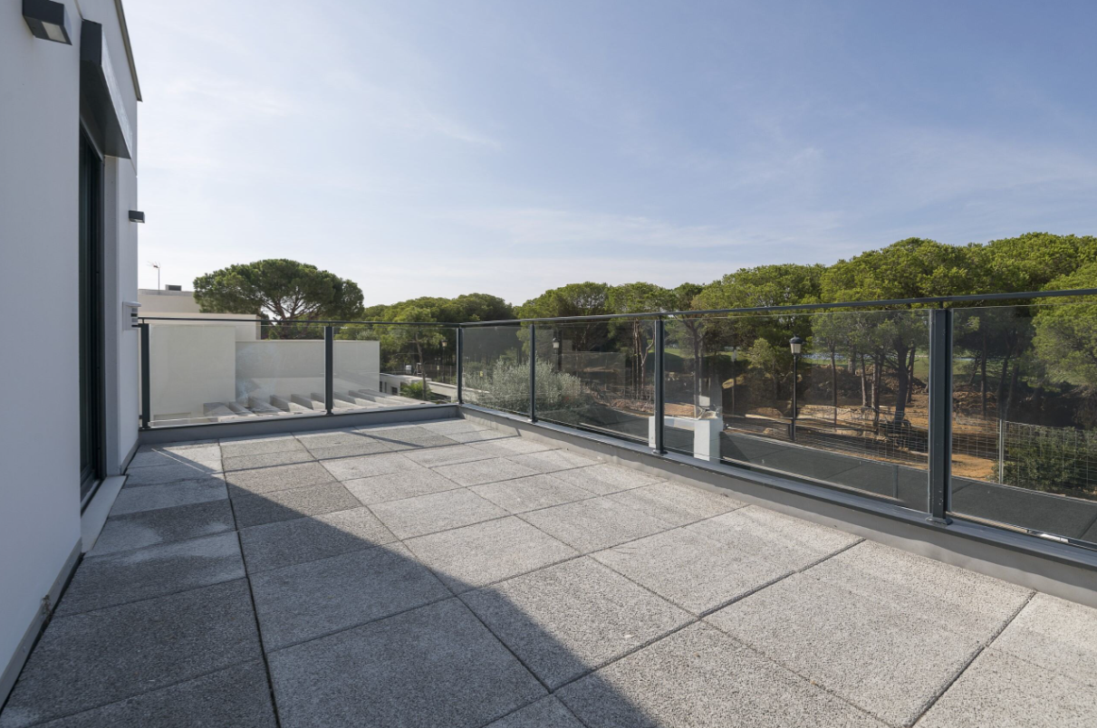 En la planta superior se distribuyen dos dormitorios dobles adicionales. Uno de ellos cuenta con baño en suite y el otro dispone de cama nido y acceso directo a un encantador porche con salón exterior, desde donde podrás disfrutar de vistas al hoyo 5 del campo de golf Sancti Petri Hills y a la parcela privada.