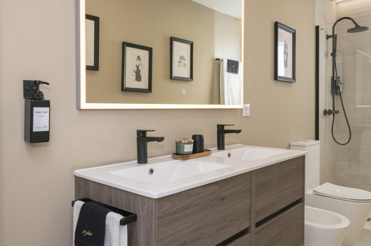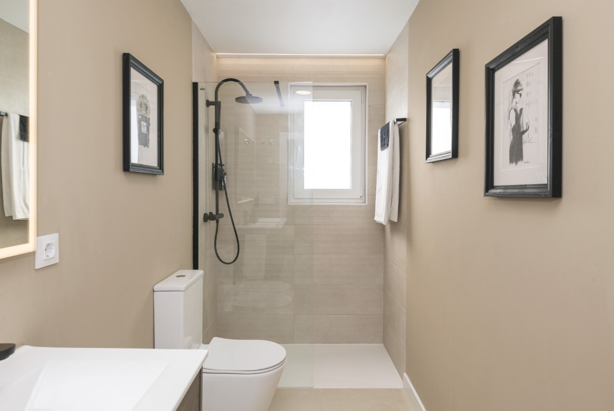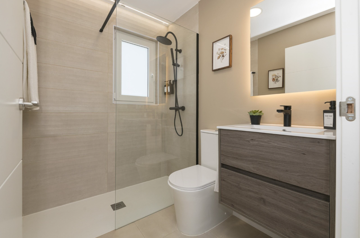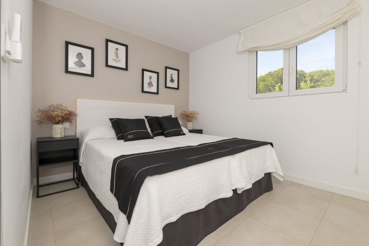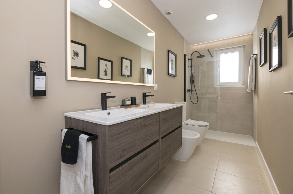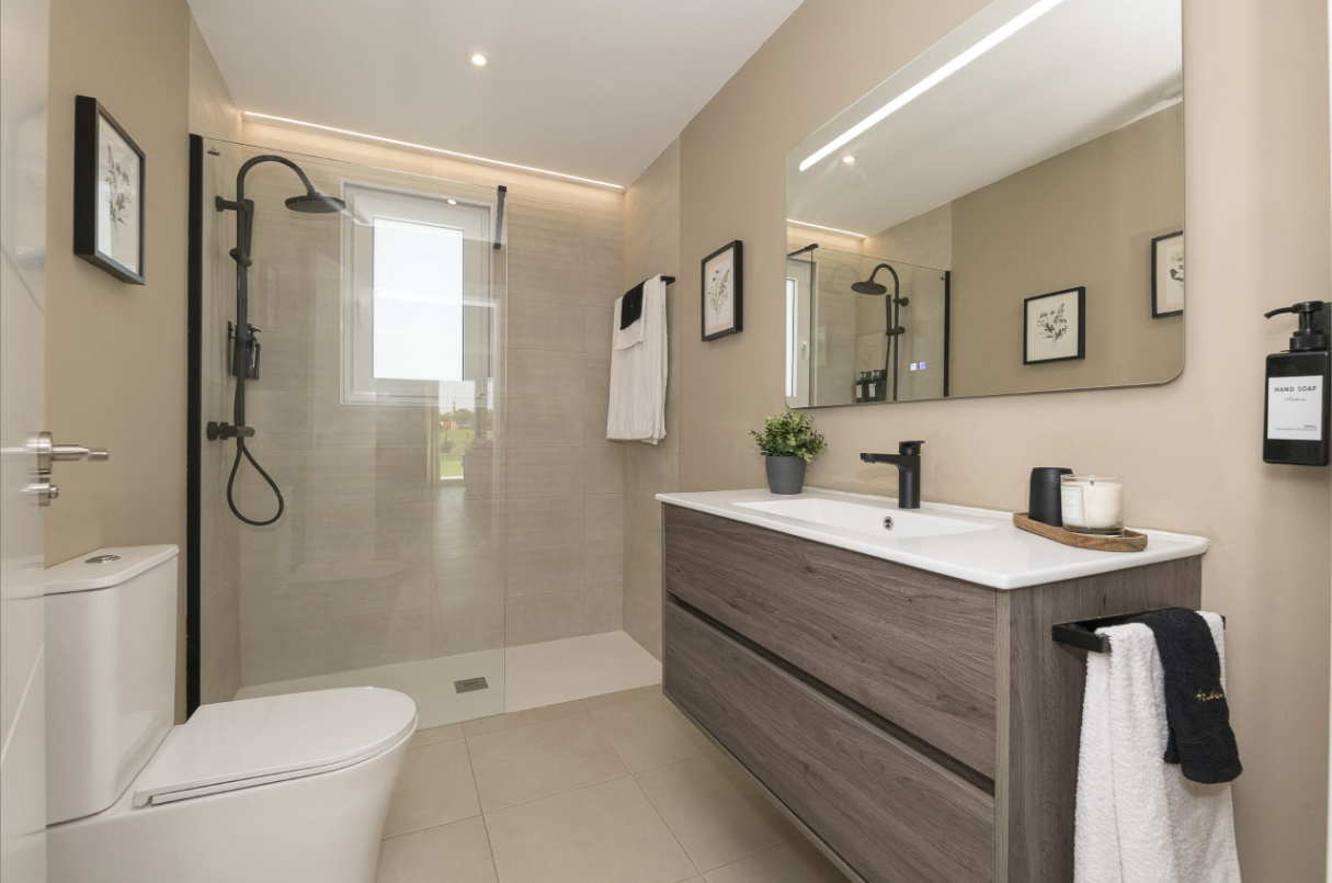 En la planta superior se distribuyen dos dormitorios dobles adicionales. Uno de ellos cuenta con baño en suite y el otro dispone de cama nido y acceso directo a un encantador porche con salón exterior, desde donde podrás disfrutar de vistas al hoyo 5 del campo de golf Sancti Petri Hills y a la parcela privada.