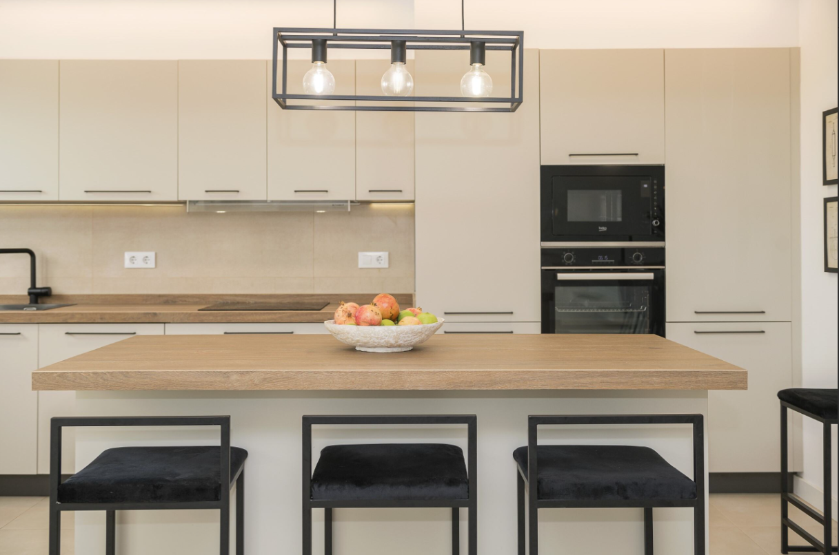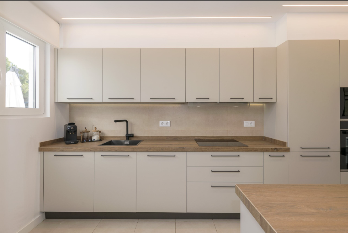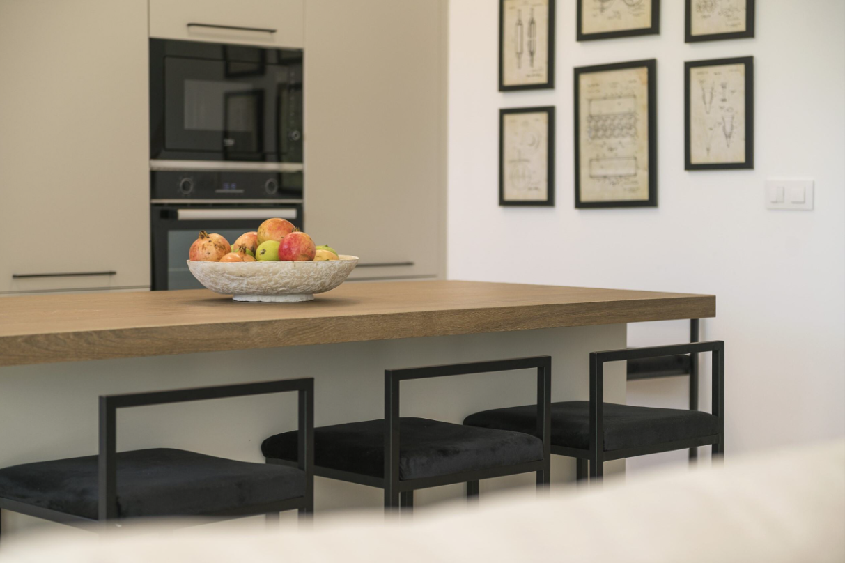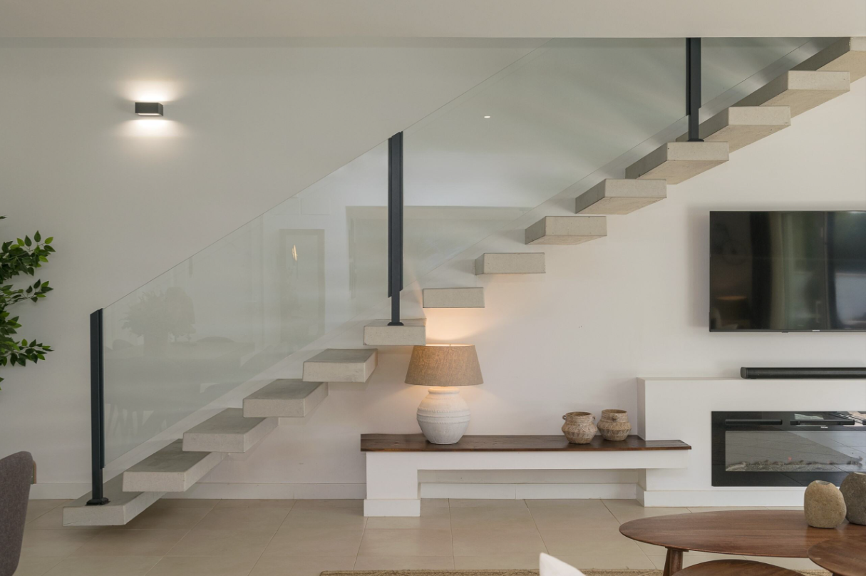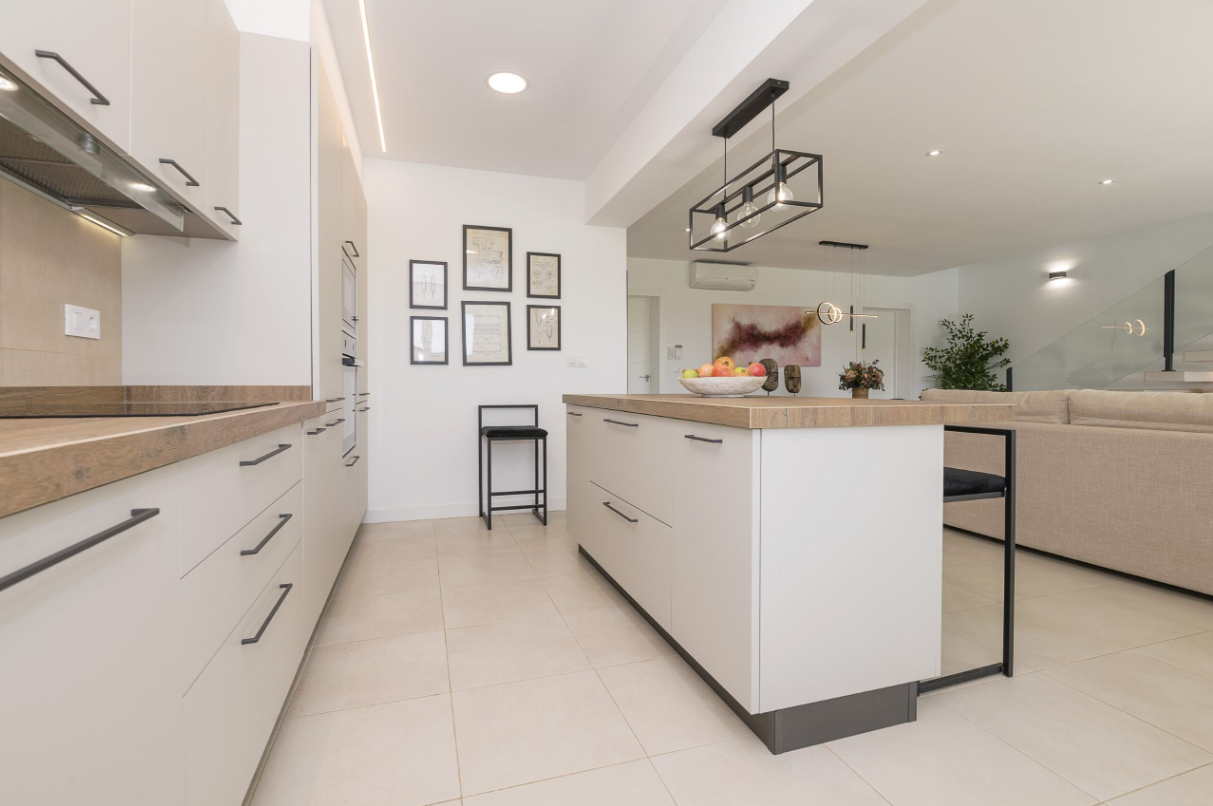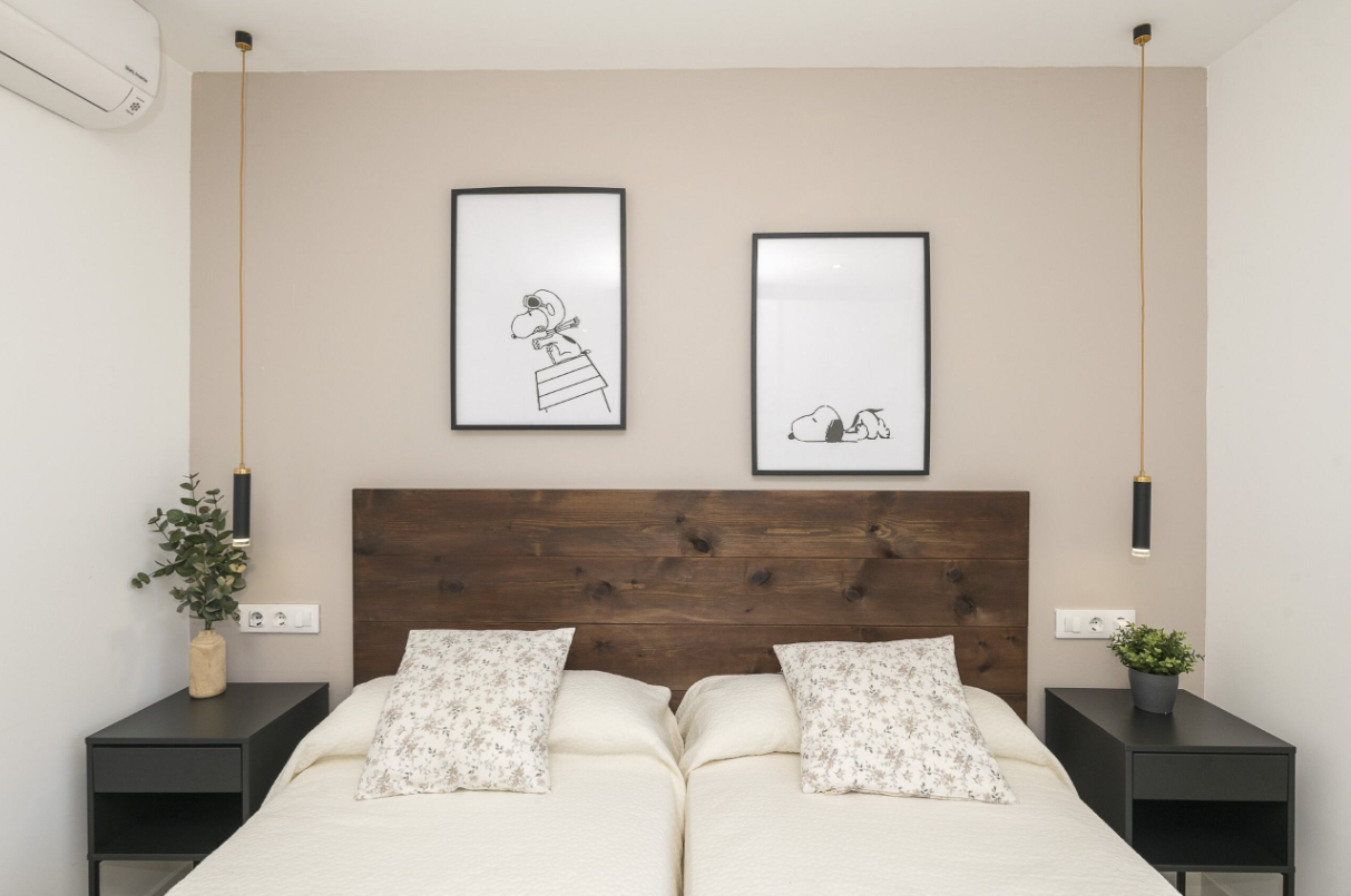En la planta baja te recibe un luminoso salón-comedor con cocina abierta en isla totalmente equipada, creando un espacio amplio y acogedor. Aquí también encontrarás un dormitorio doble con dos camas individuales (90×200 cm) y un baño completo con ducha. Además, el salón dispone de un cómodo sofá cama italiano (160×200 cm). Desde esta planta se accede a un precioso porche exterior con zona chill out y comedor al aire libre, perfecto para largas sobremesas.