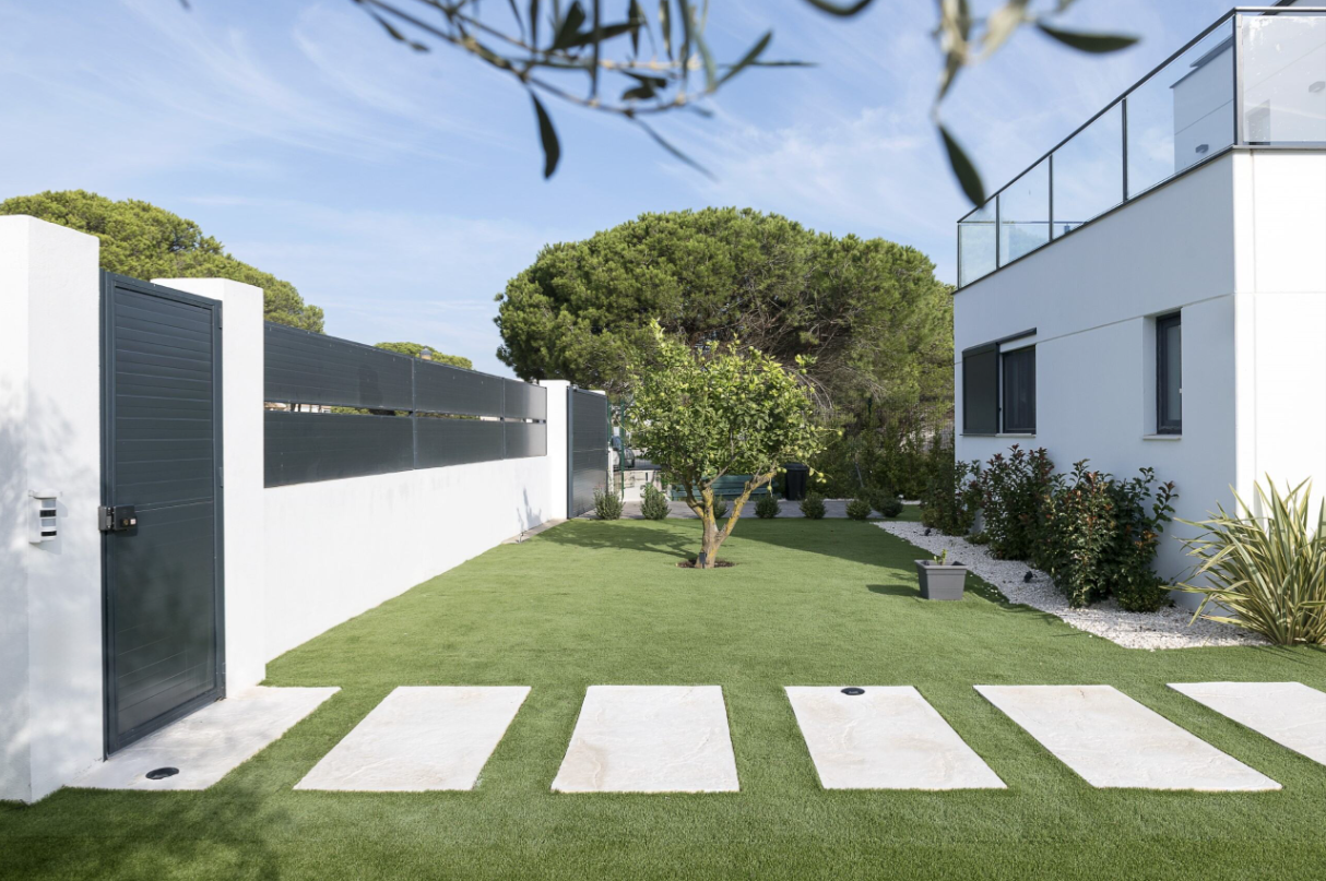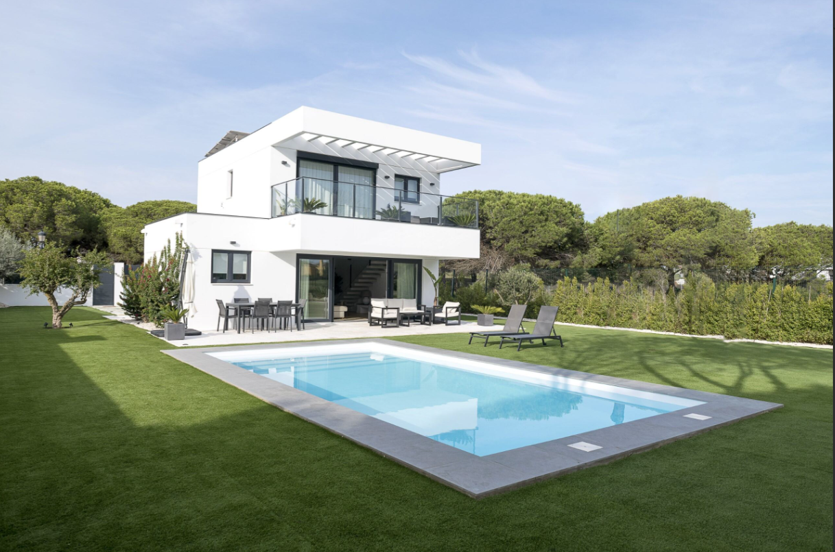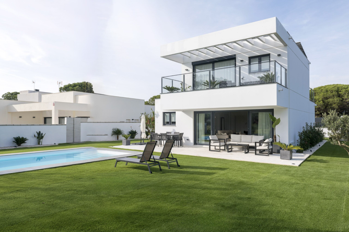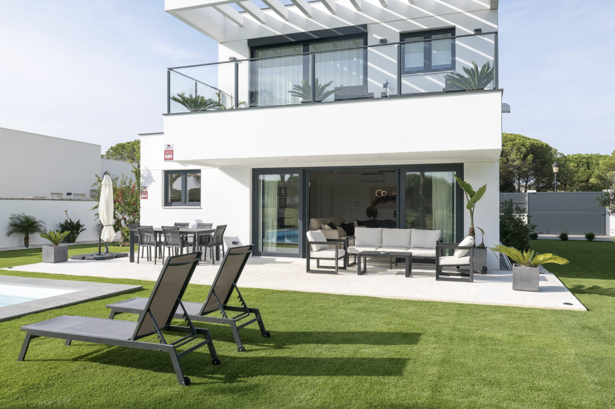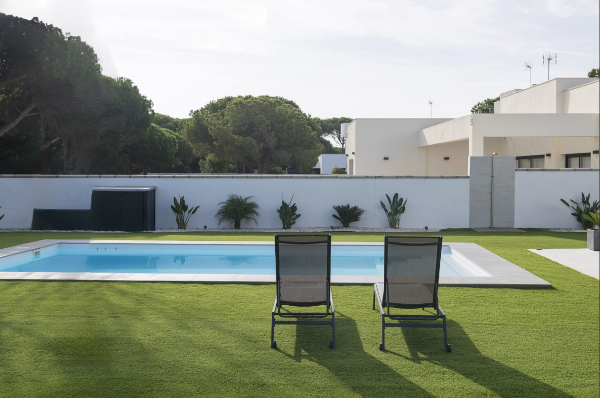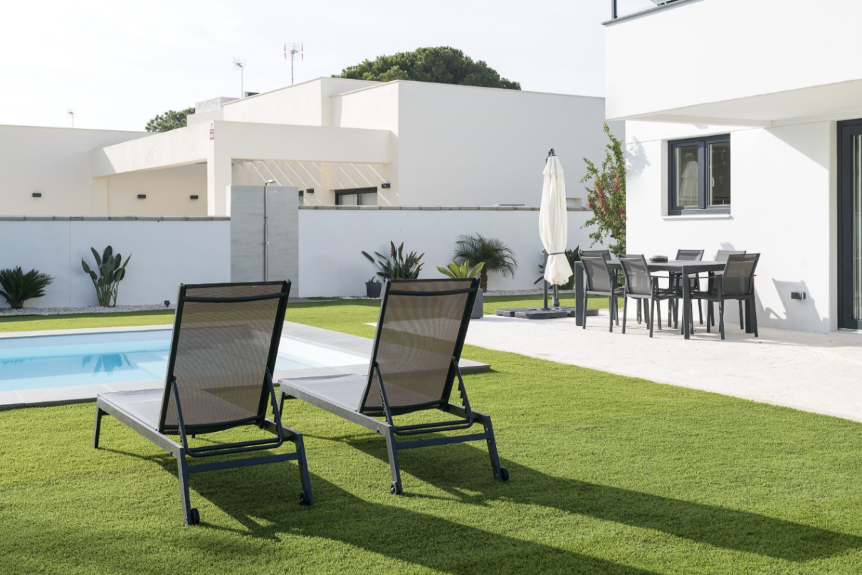 El exterior de la villa es uno de sus grandes atractivos: piscina privada rodeada de 4 hamacas y 2 sombrillas, ducha exterior, zona de barbacoa de gas y amplios espacios para relajarse o disfrutar en compañía. Además, dispone de aparcamiento interior para un vehículo y posibilidad de estacionar fácilmente en la calle.